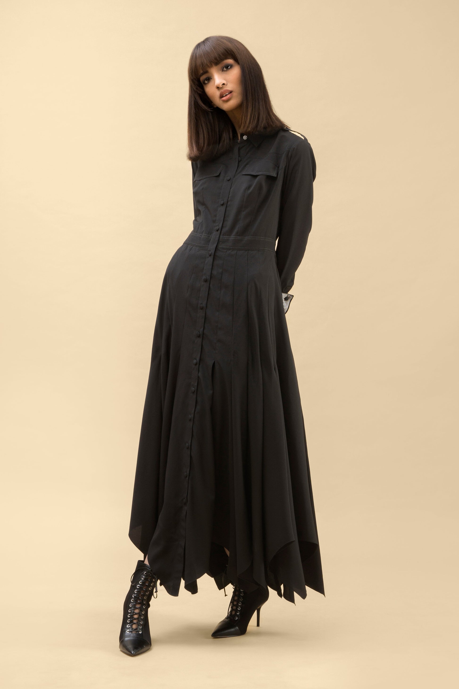 A long cascading shirt dress with full buttoned front and pockets detailed with hadmade buttons and military accents