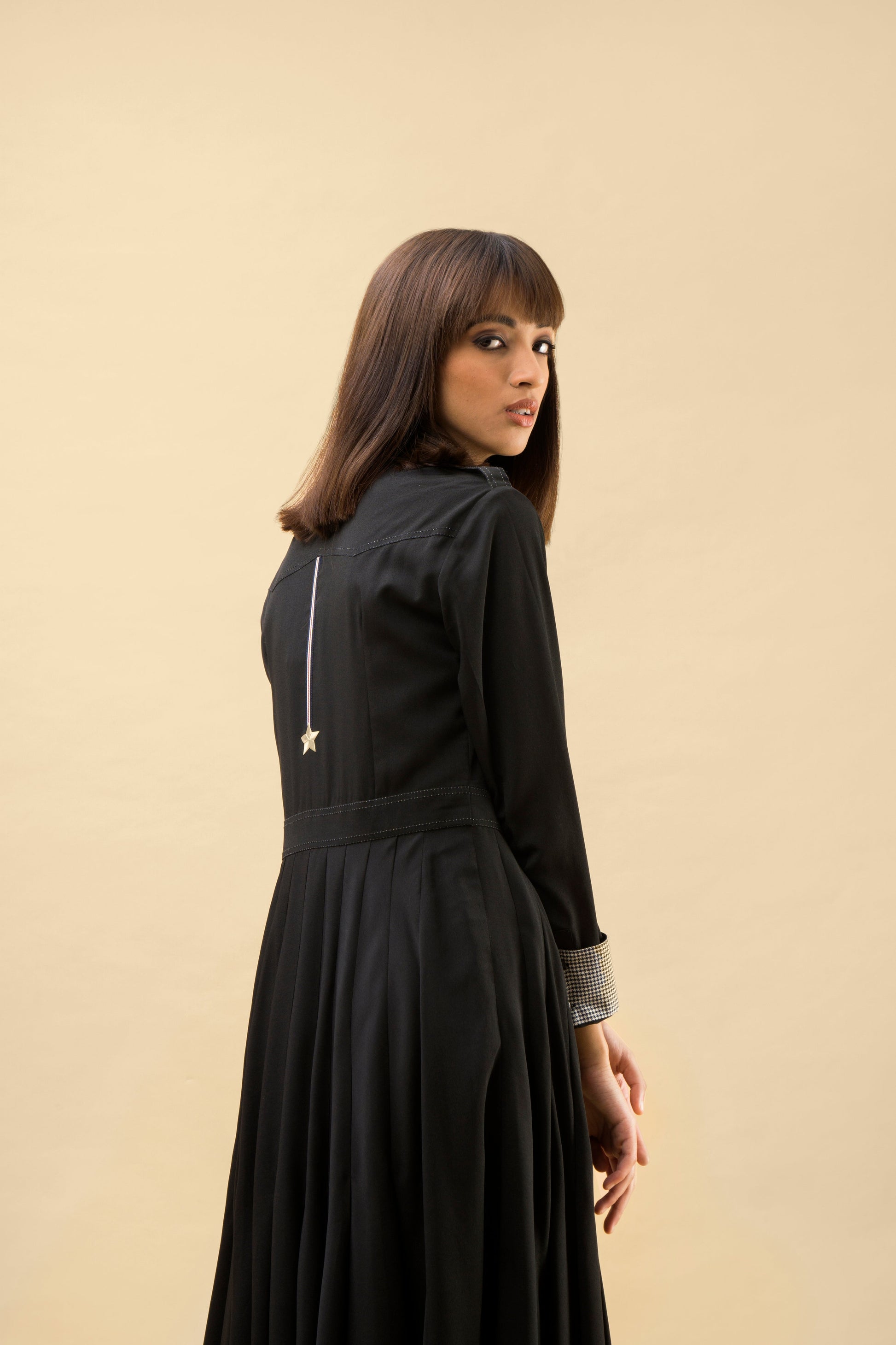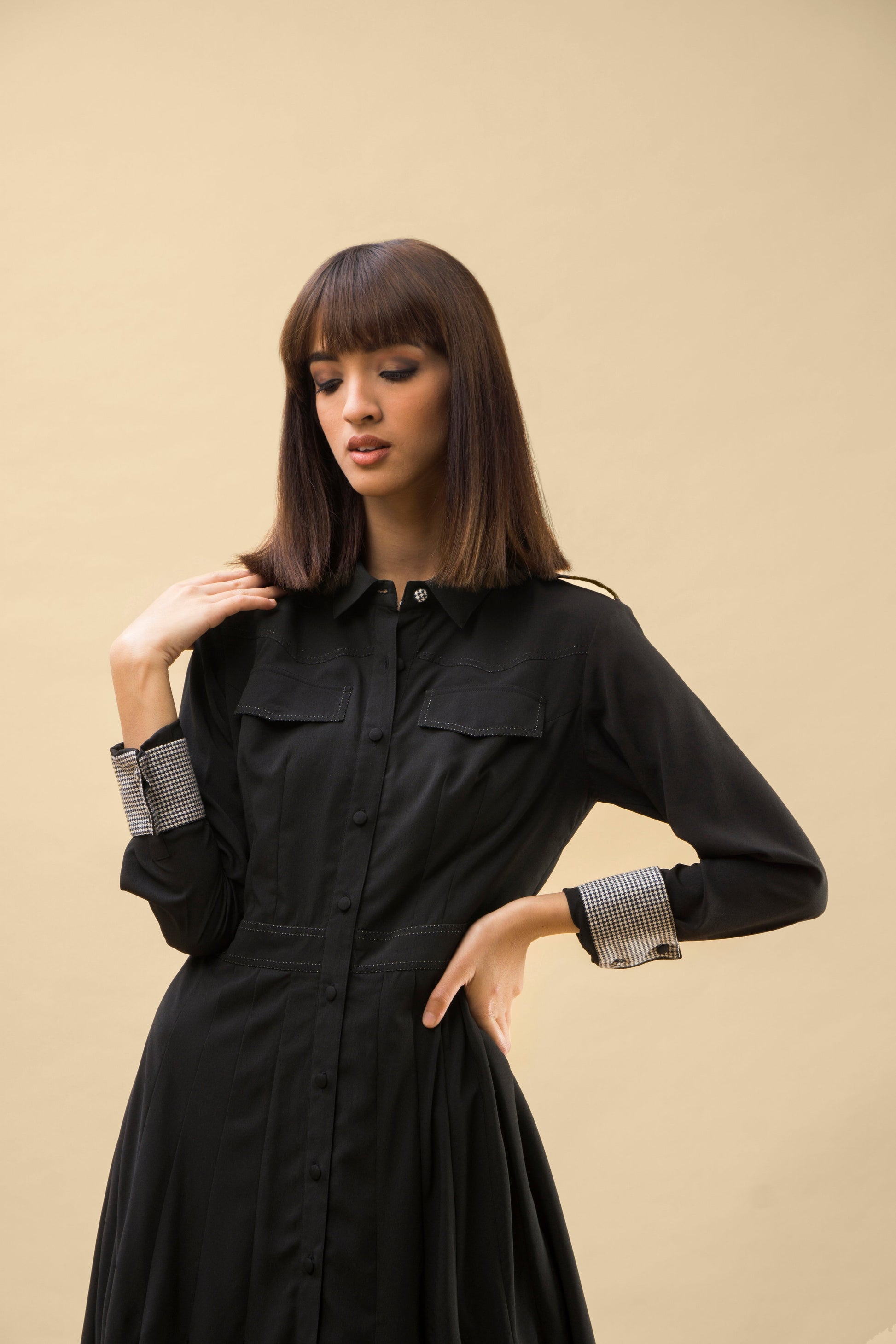 - Long sleeves with check facing details and buttons