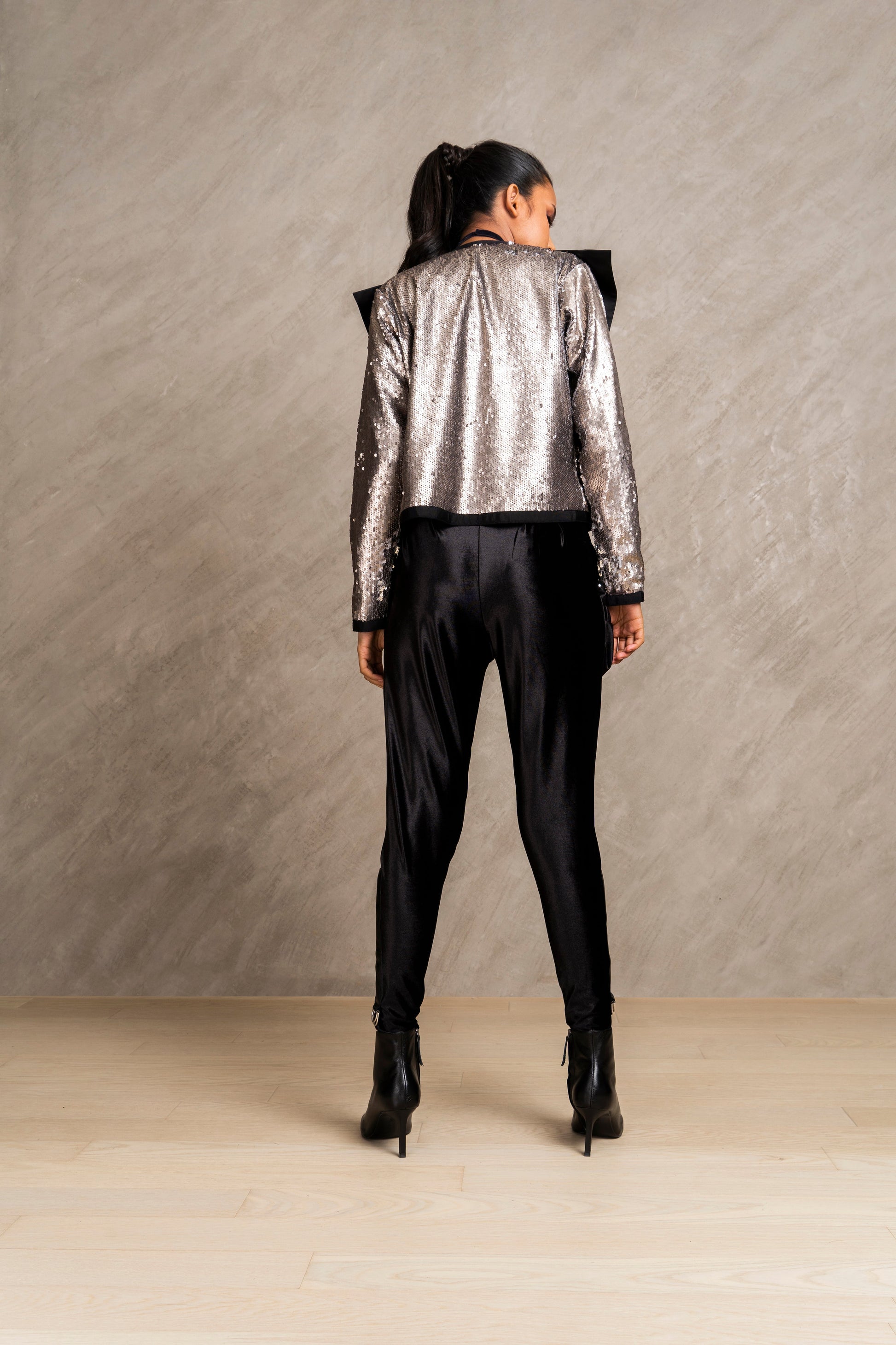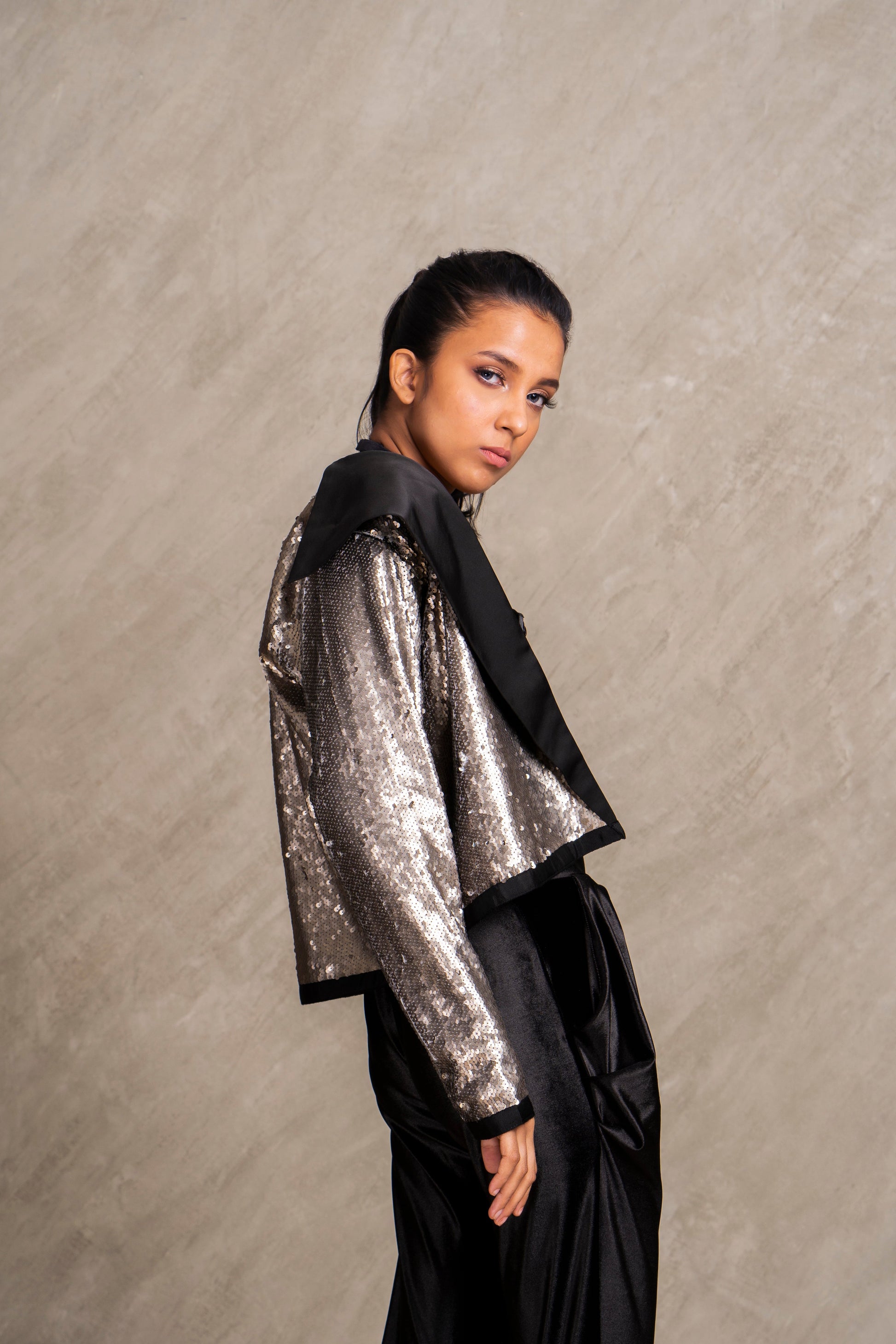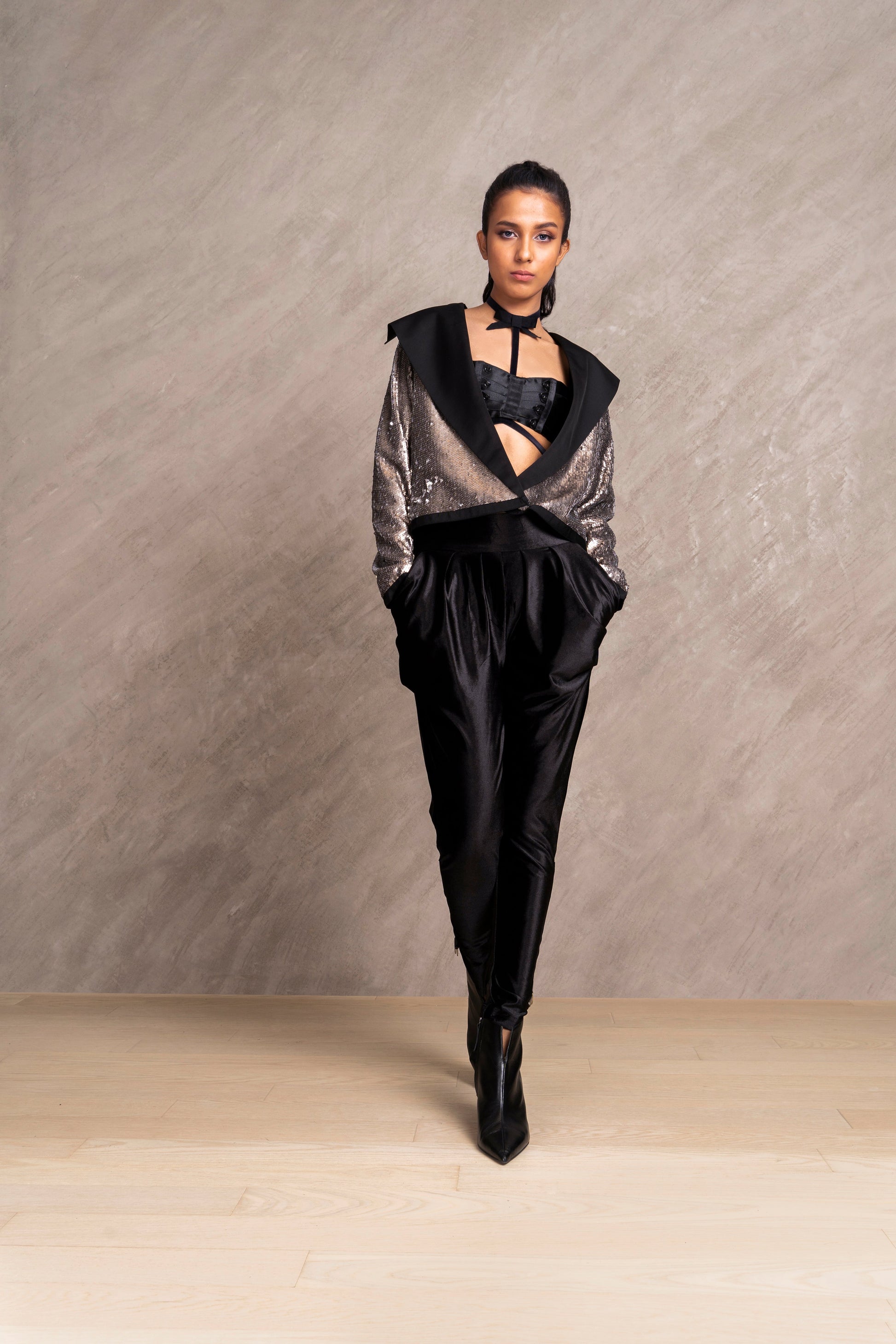 Prepare to dazzle in our beautifully crafted sequin jacket with oversized satin lapels featuring adjustable waist fasten hooks in black with imported ribbon finishing and black satin lining inside. Complete your glamourous diva look with LILITH pants