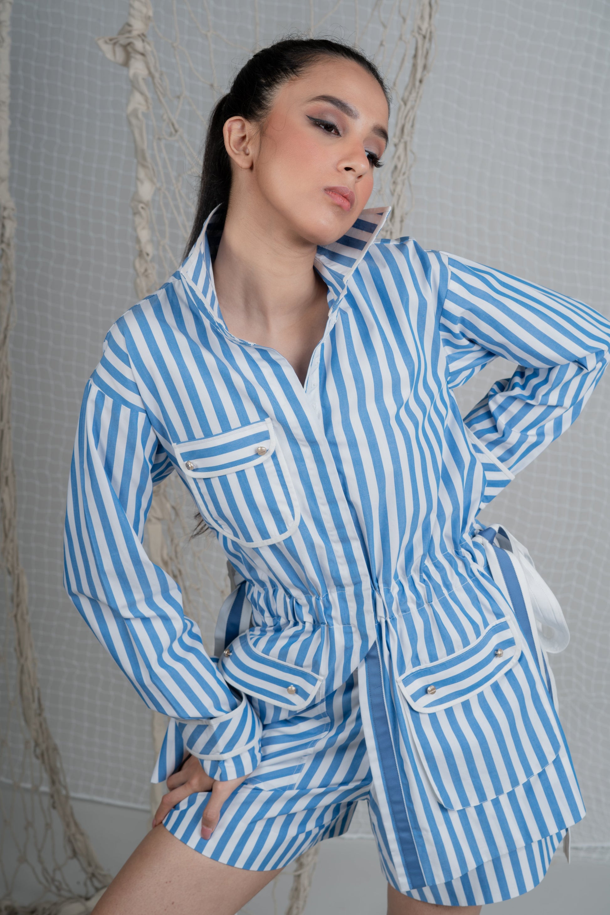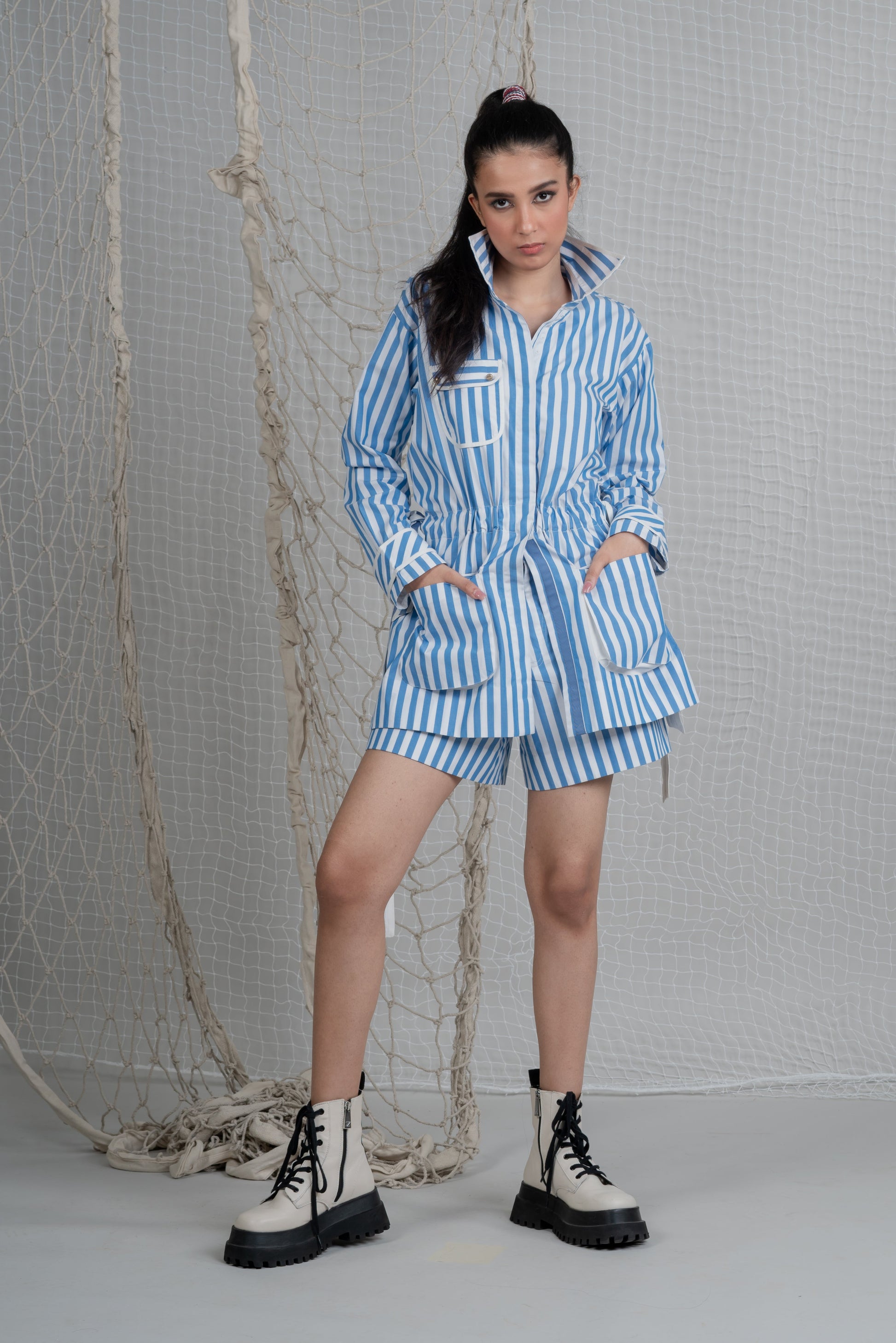 Lightweight Jacket shirt in Breton Stripe, with front pocket, gold buttons and ribbon tie on the waist. Pair it with 𝖱𝖠𝖸 Shorts for a smart coord set