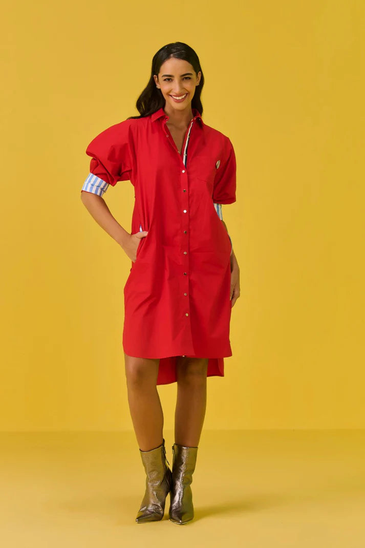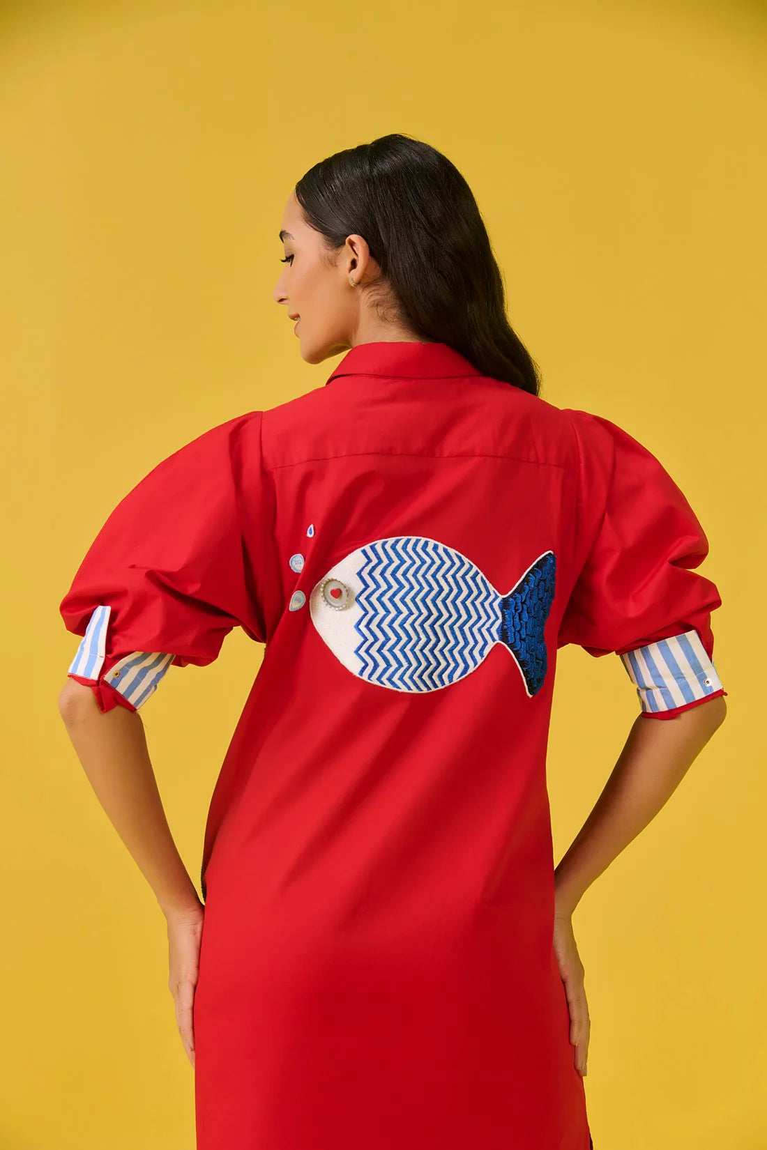 Step out in style in this chic shirt dress, featuring a short and long front and back hemline. The dress features voluminous elbow length sleeves. The standout detail is a quirky, colourful fish embroidery adorning the back, giving the dress a playful and artistic touch.