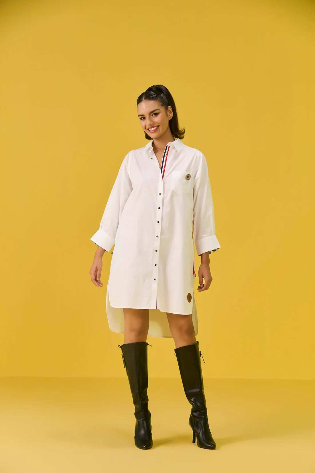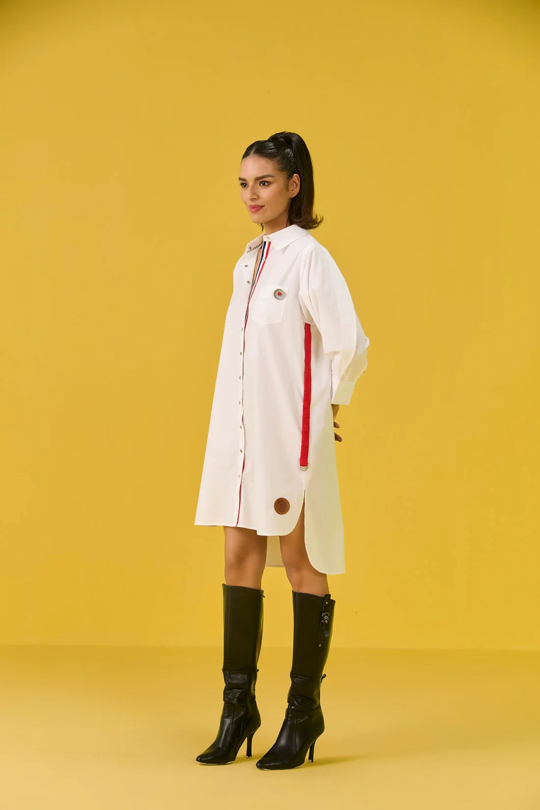 - Straight fit knee length shirt dress with metallic button opening in the front