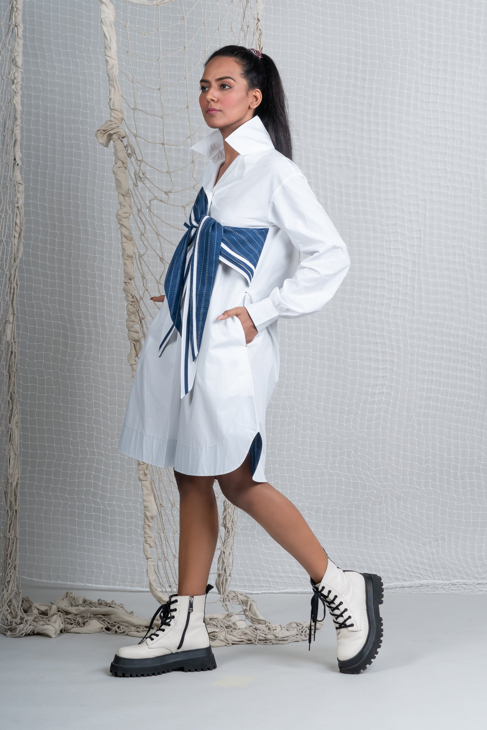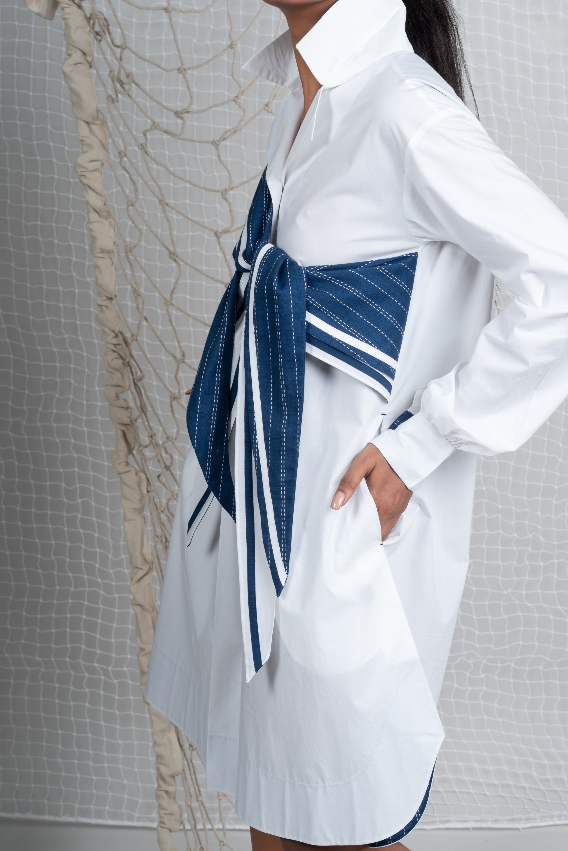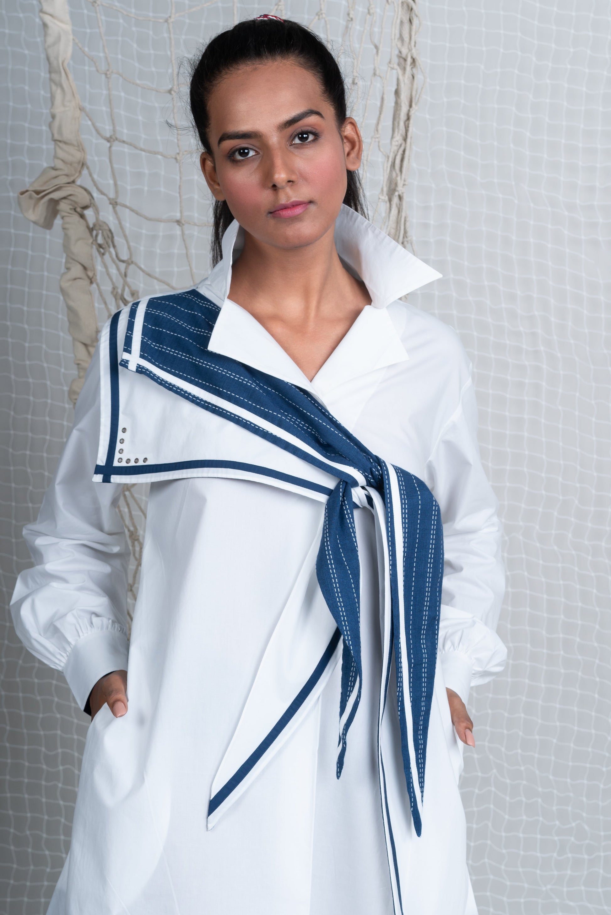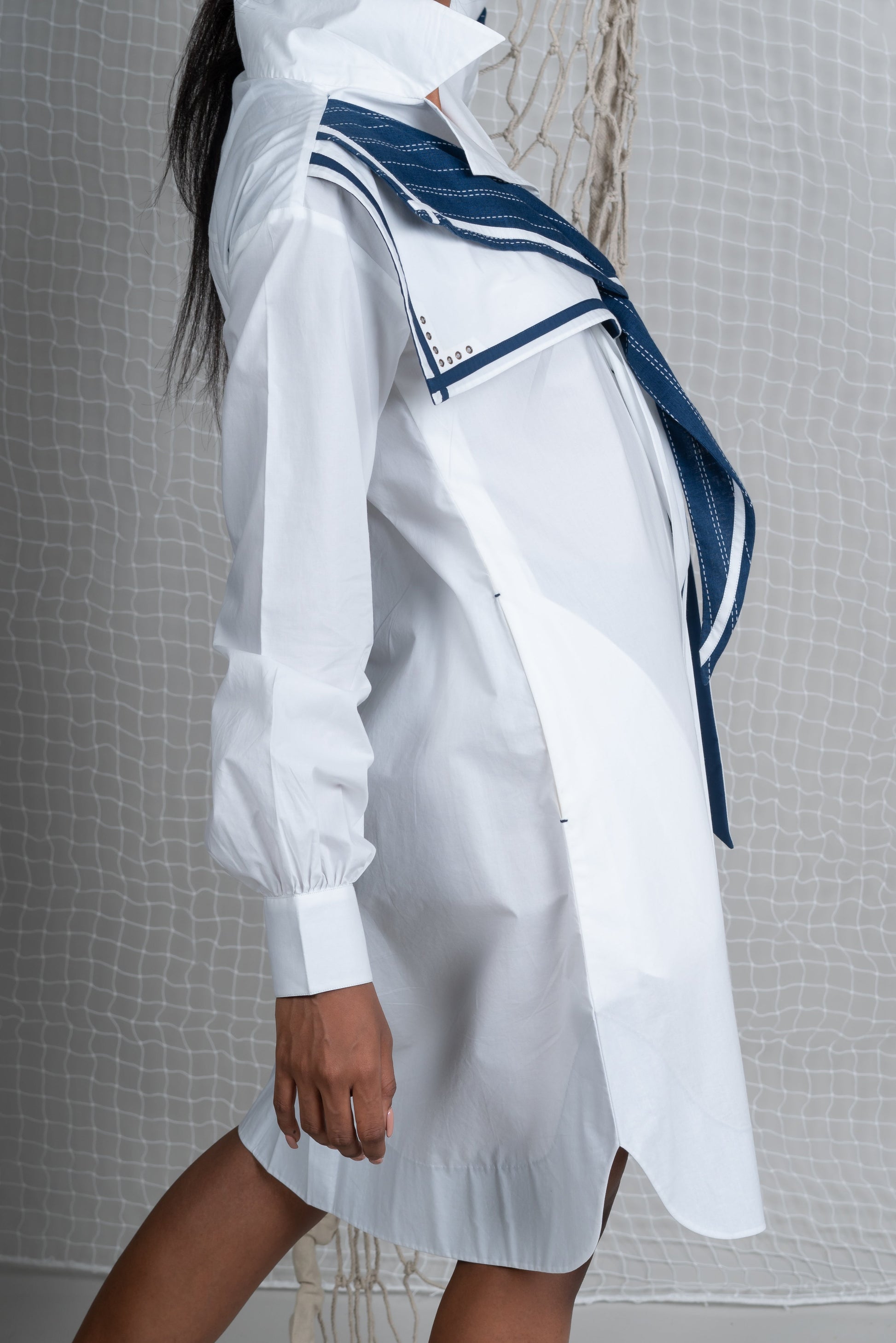 Straight fit sailor dress with short lapel collar and curved hem on the sides. The double scarf detail gives the dress a quirky yet chic statement.