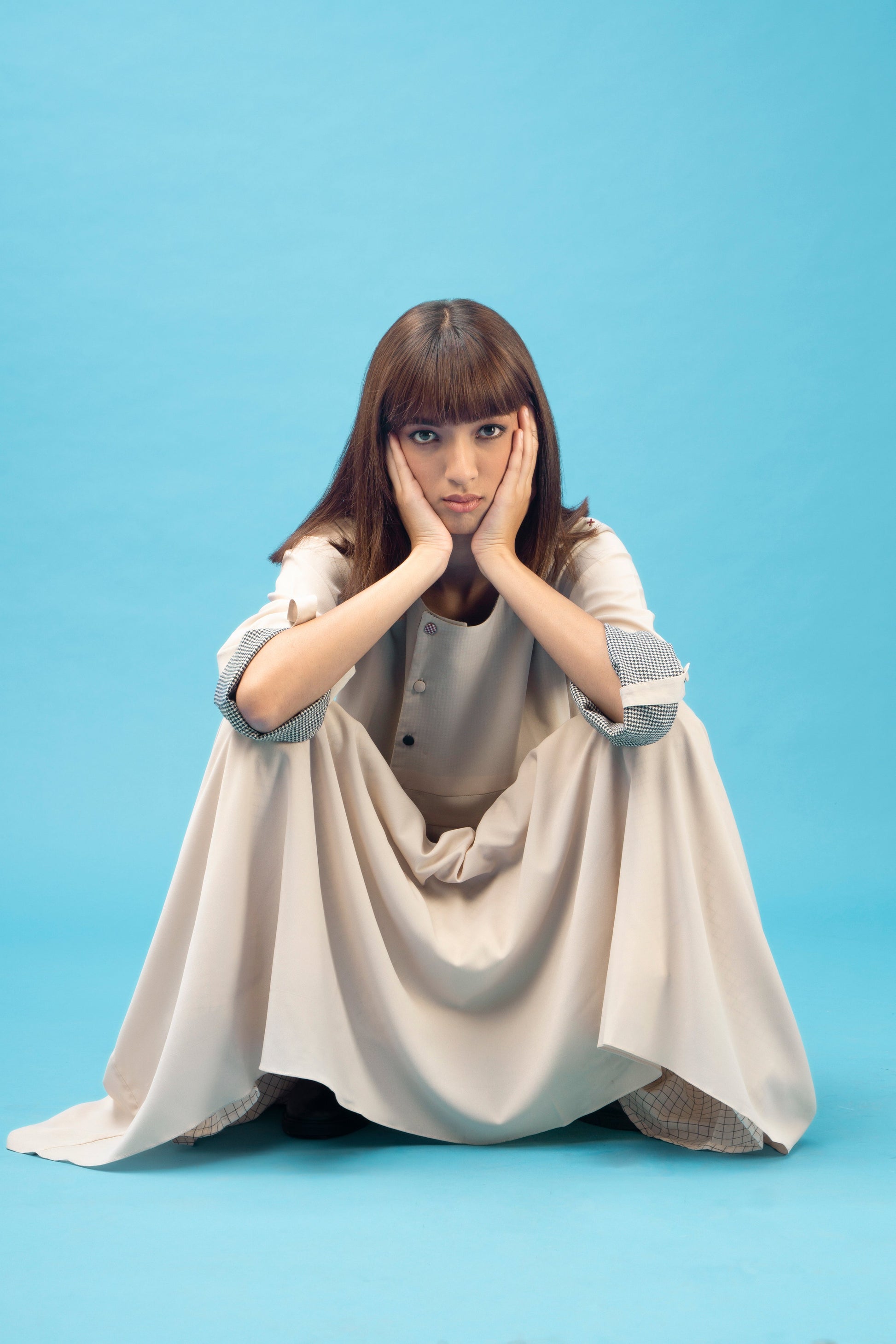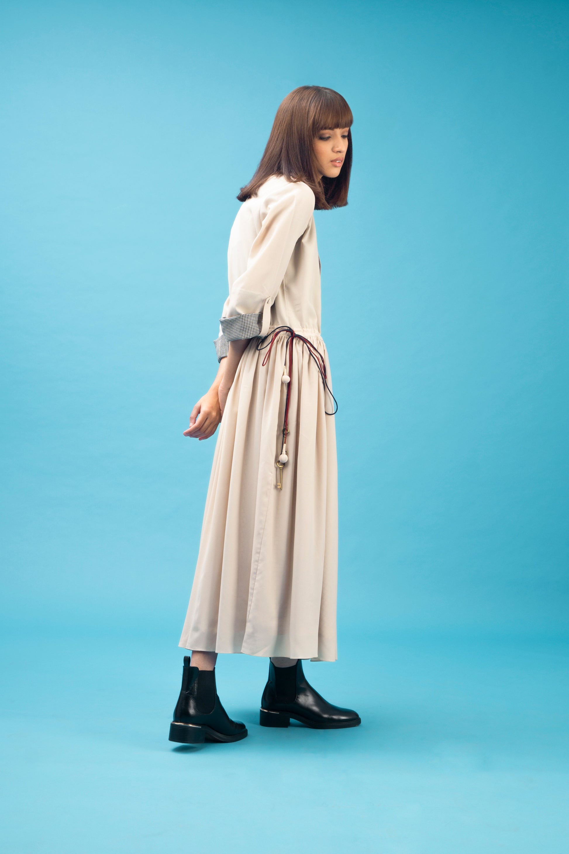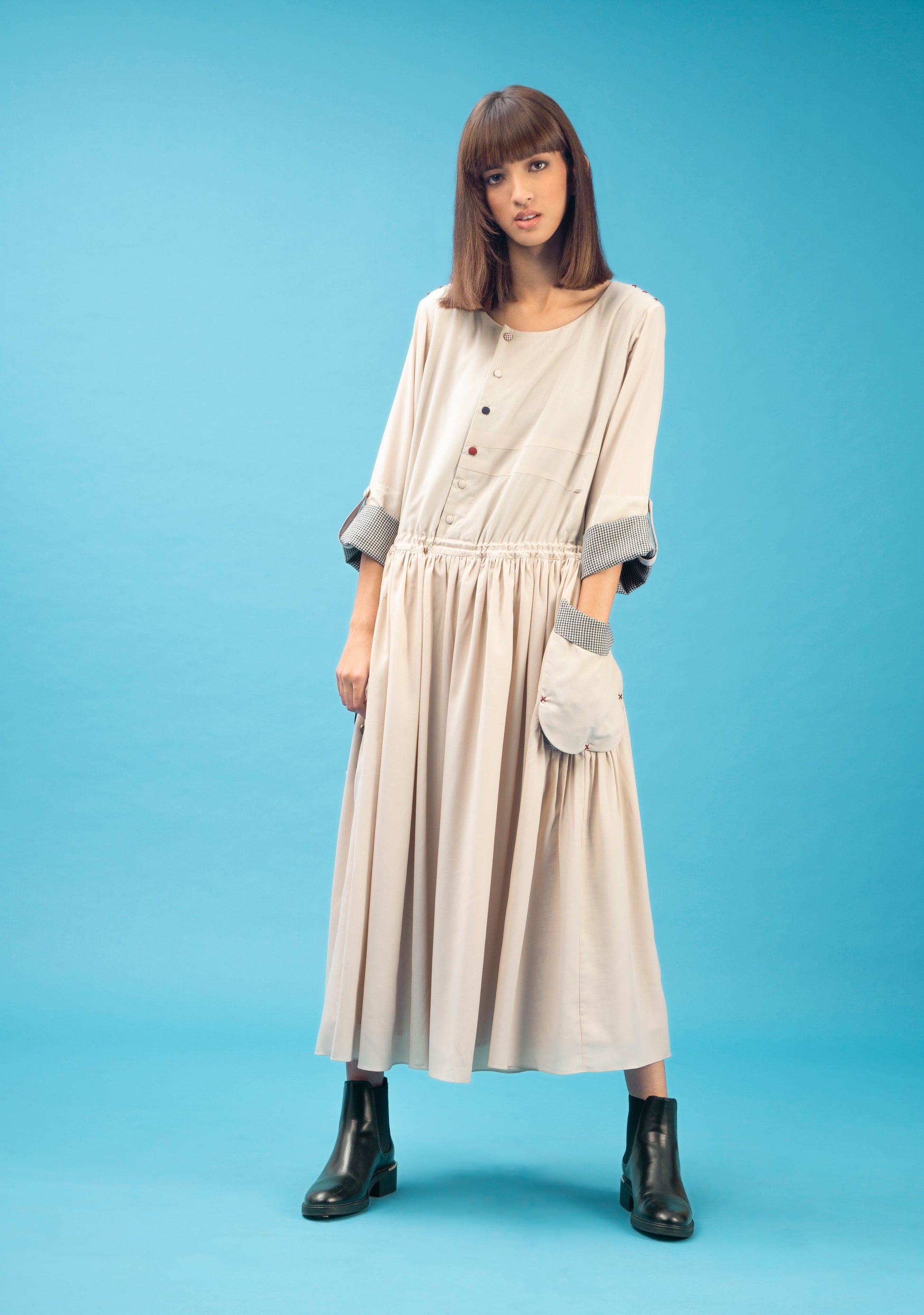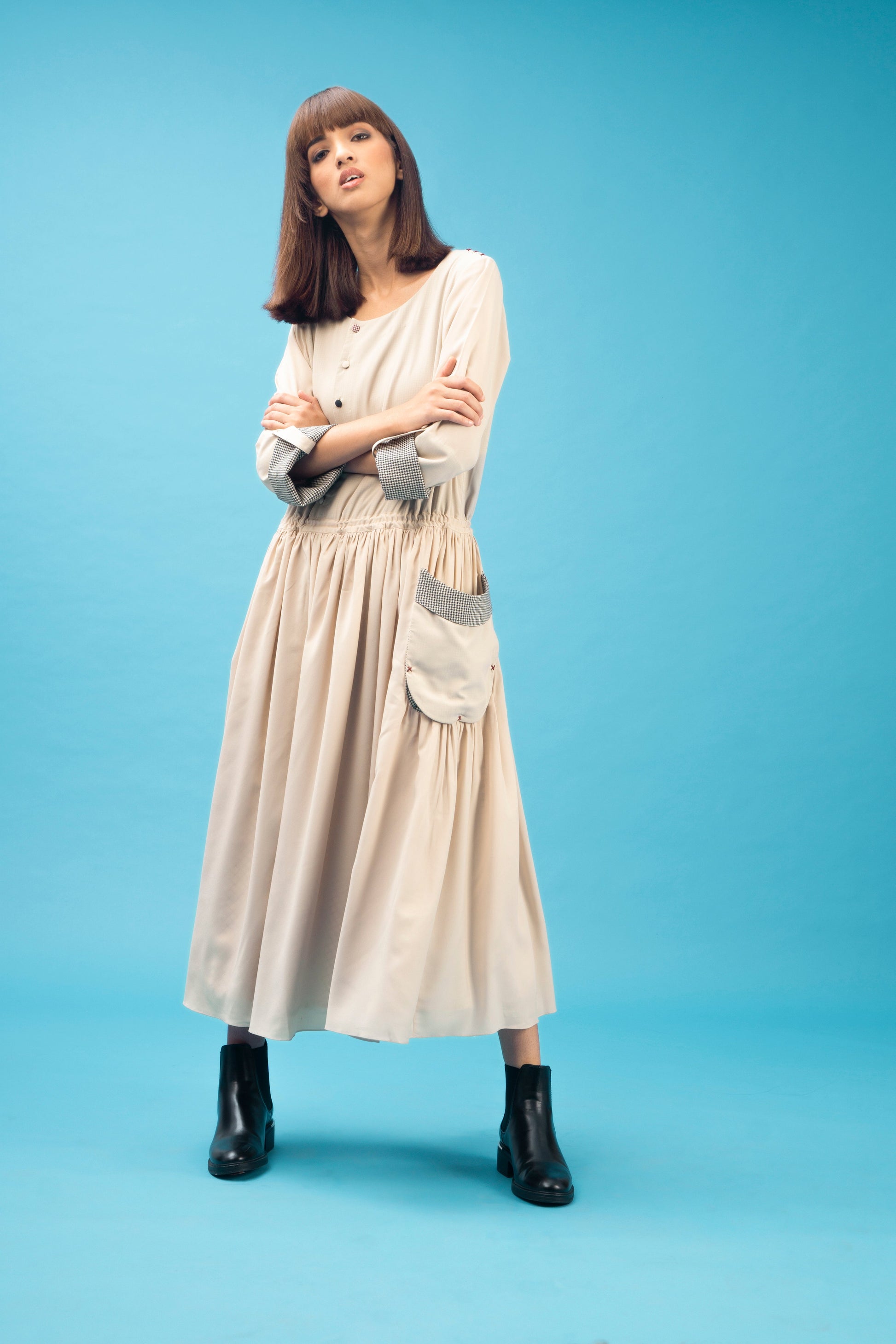 Long dress with tie belt and three quarter length folded sleeves in checks and large pockets and hand stitch details.