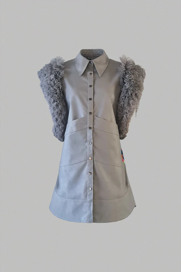 Our bestseller Bowie is now available in silver-grey faux leather and silver tulle, featuring neon PVC details at the back for that perfect Coldplay concert vibe.