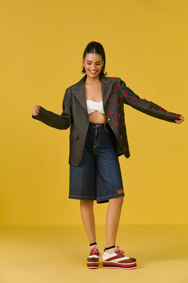 Say hello to these knee-grazing bermuda shorts that are tailored to perfection and decked out in unexpected details. With bold stitch line detailing, the shorts are highlighted with a rhinestone studded lip brooch. They’re the kind of shorts that pair just as well with a sharp blazer as they do with an oversized tee.