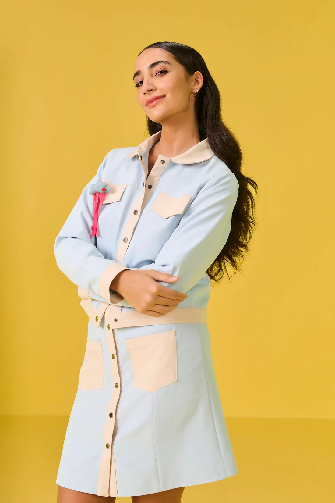 Meat your new wardrobe chameleon: a smart, chic top that cleverly blurs the lines of a short coat. Designed with sleek, slim sleeves, it offers a refined silhouette. The contrasting details add unexpected pops that make every wear an intriguing statement. Pair it with our Mode skirt to complete a chic look.