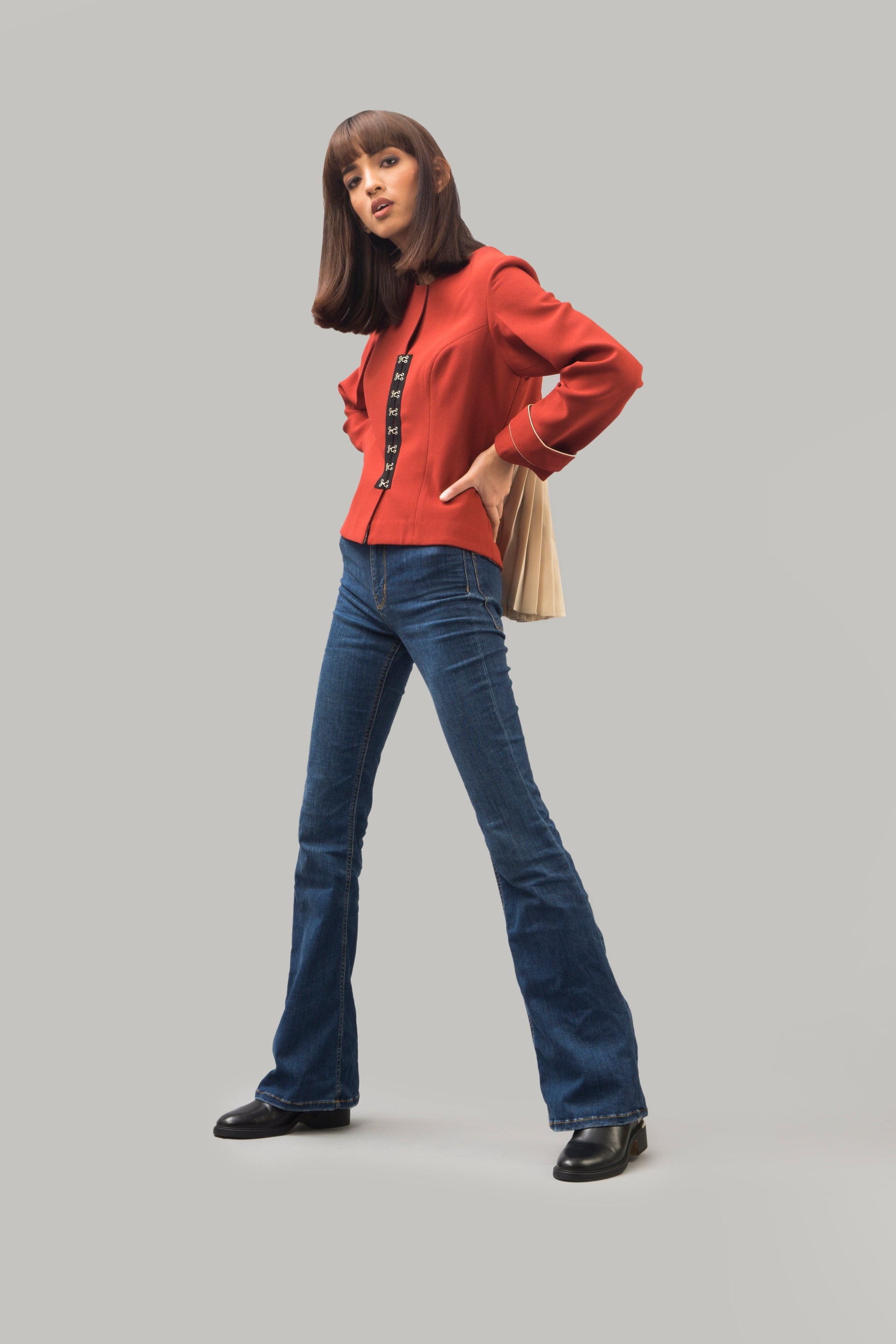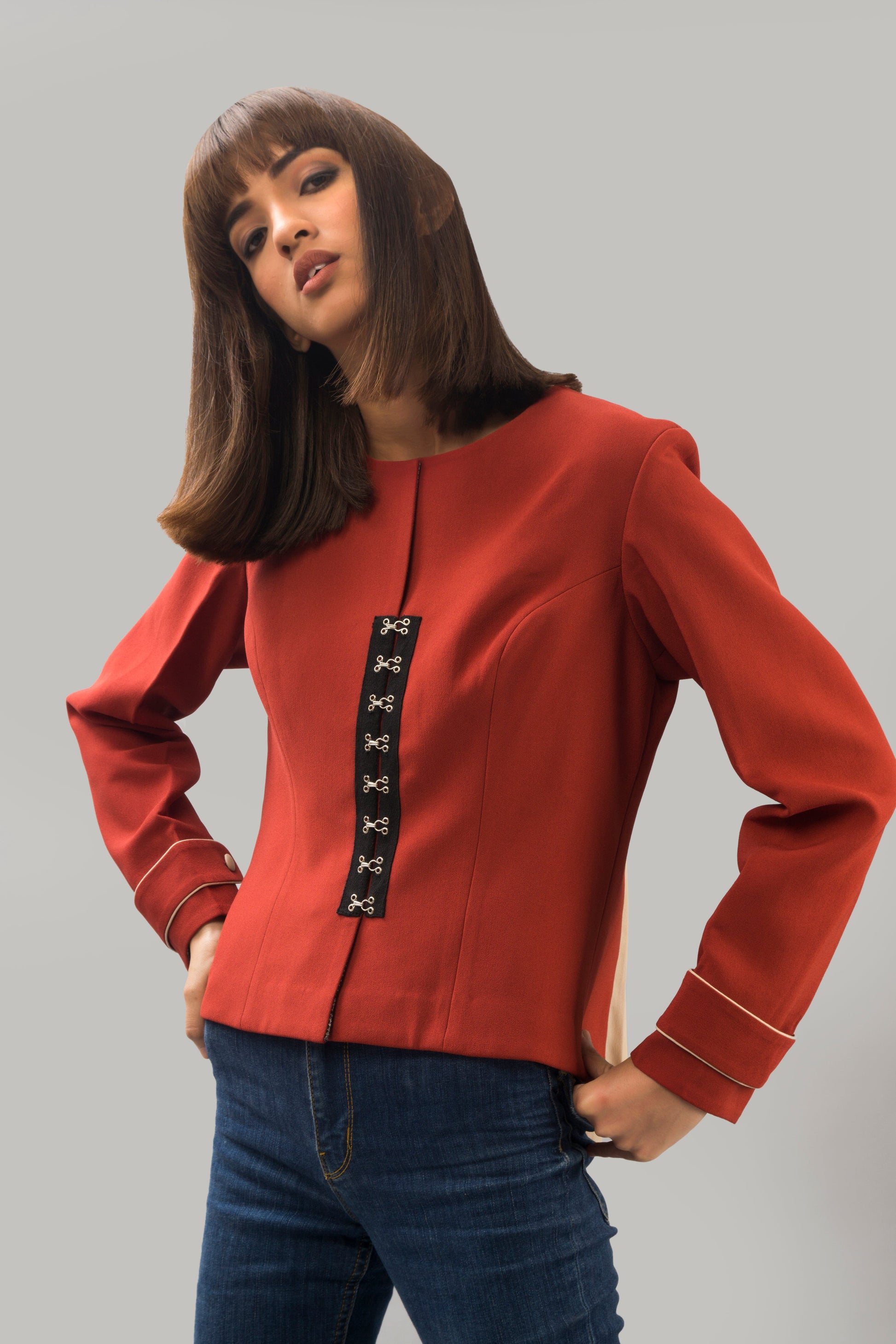 A tailorfit short jacket with front hook details and contrast colour flared pleat details at the back