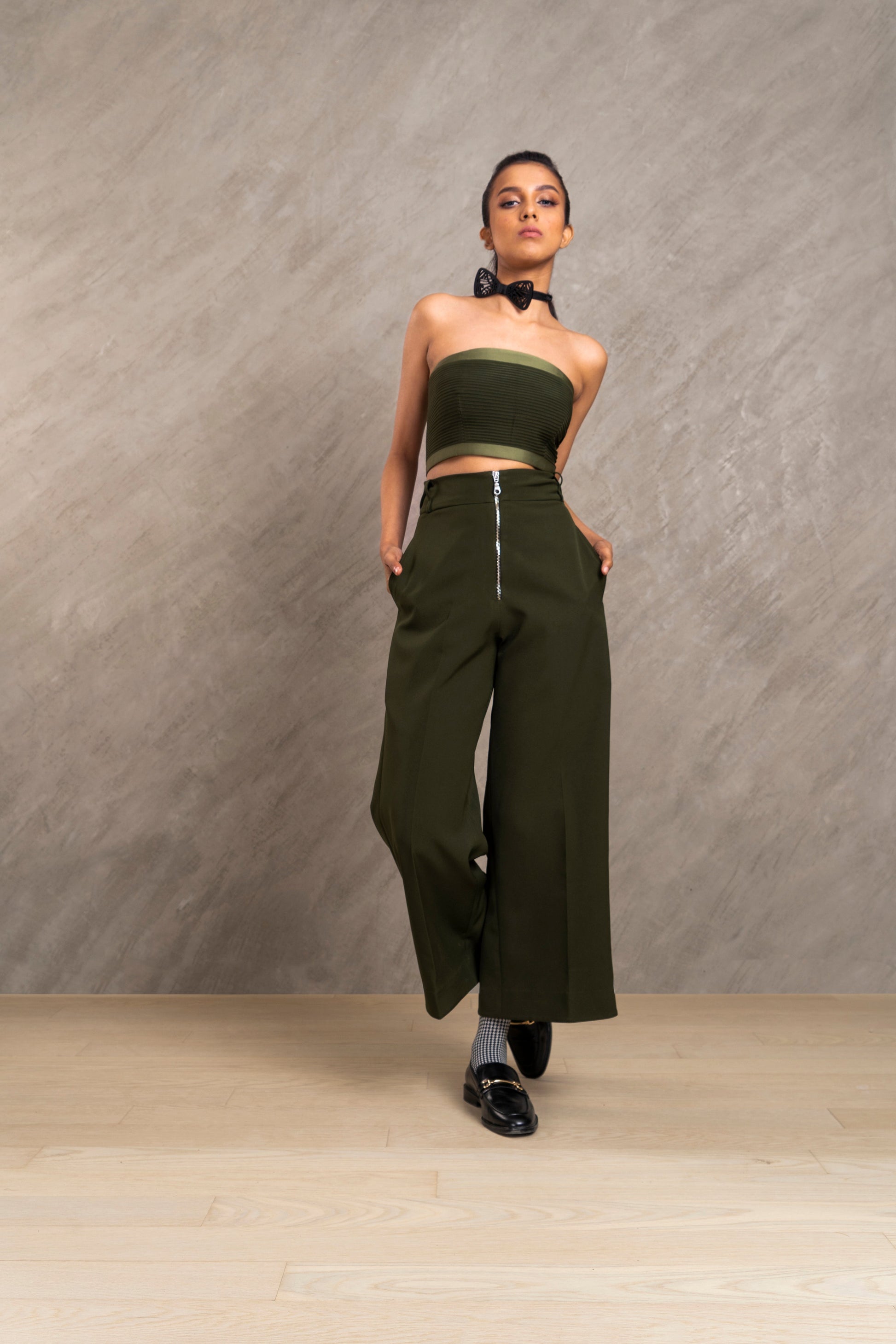 High waisted flare pants with front closing metal zipper featuring a collar fold detail on the waistband which can be accessorized by a belt; finished off with a gold button at the back.