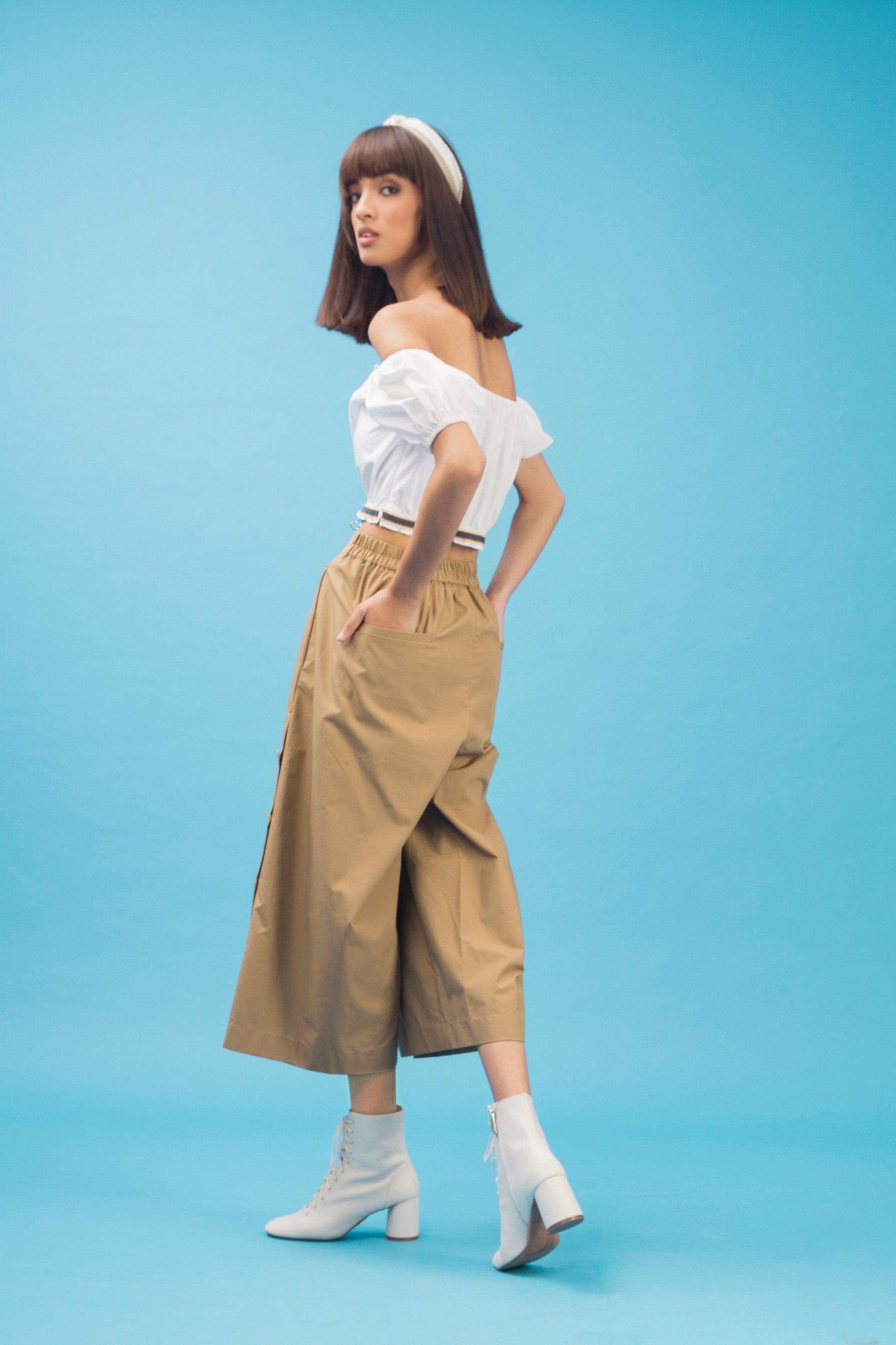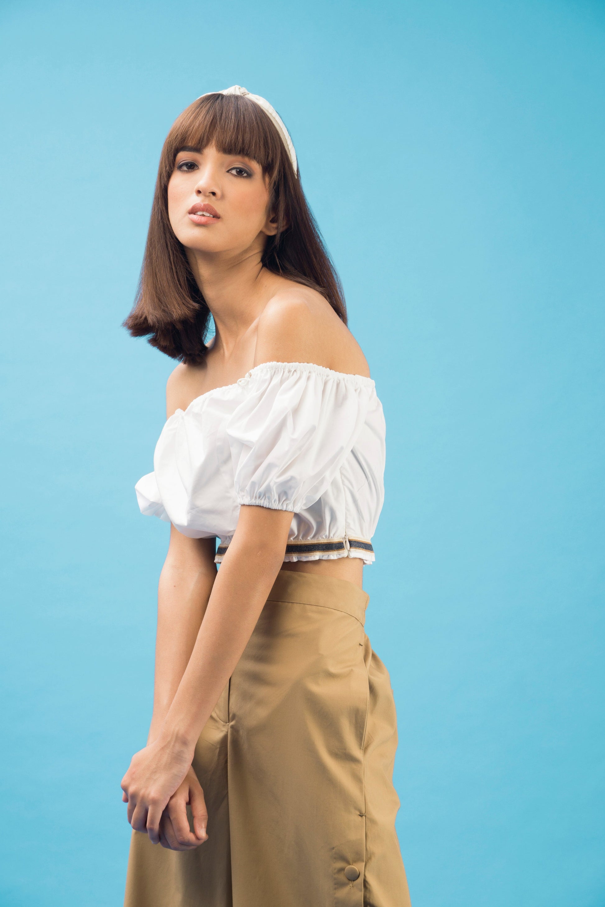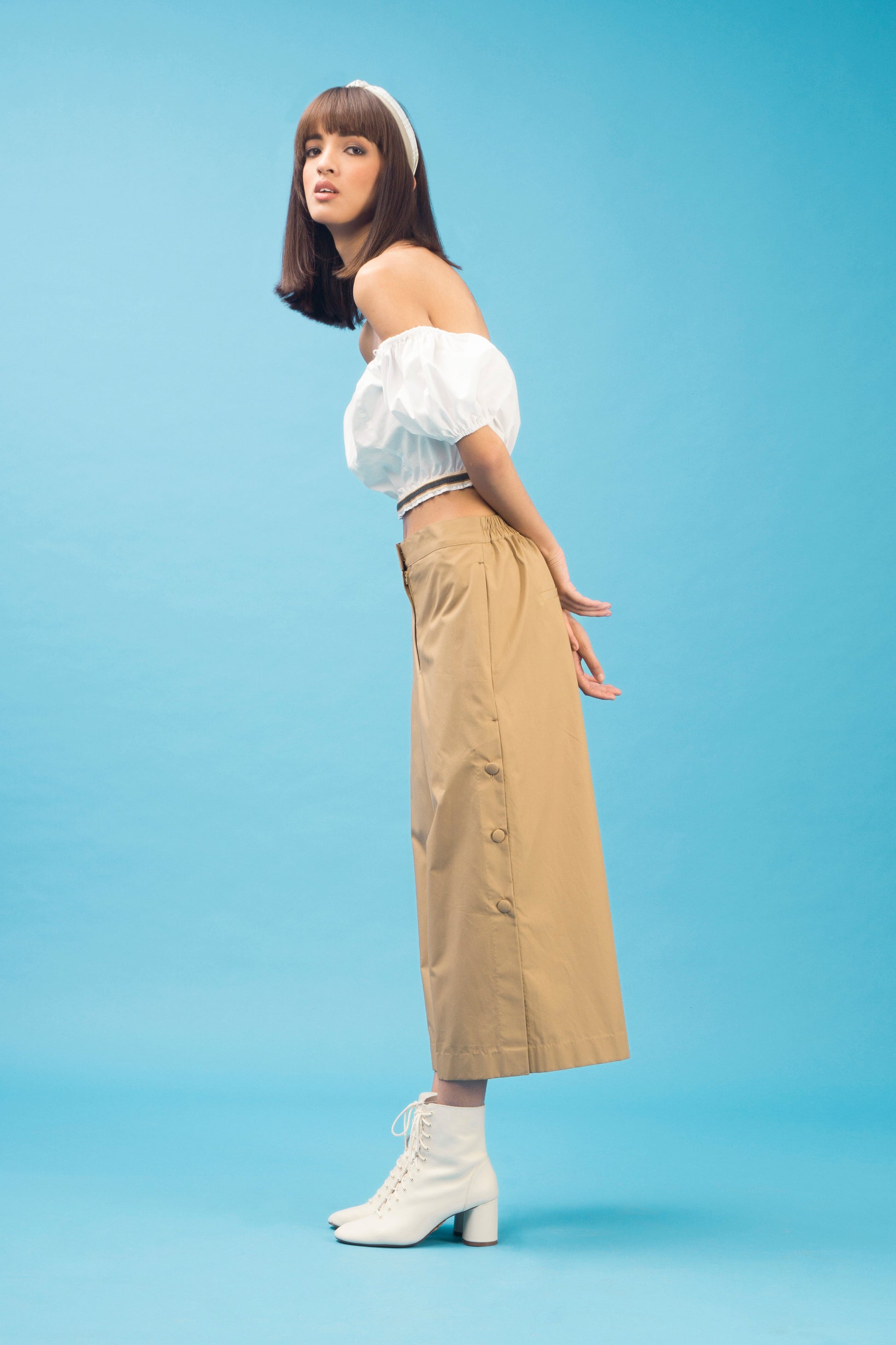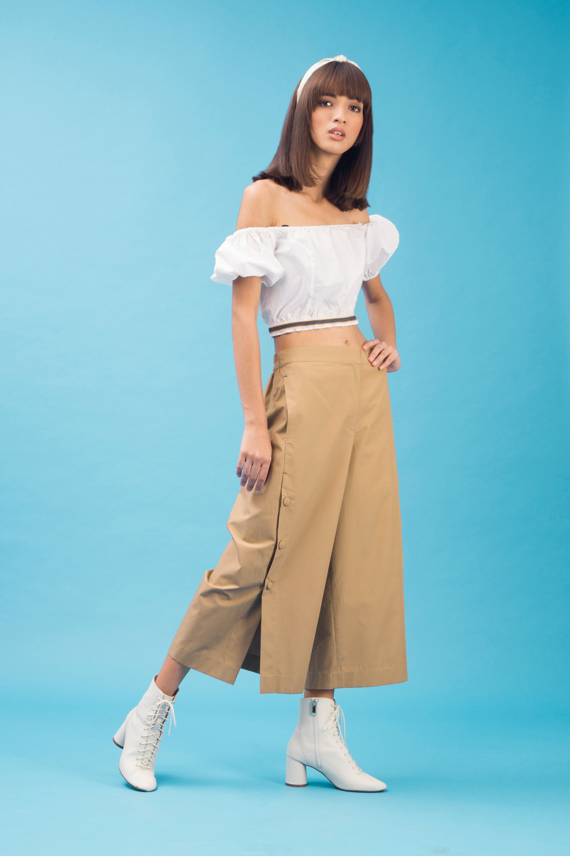 An off-shoulder crop top with puffed sleeves and piping details at the bottom