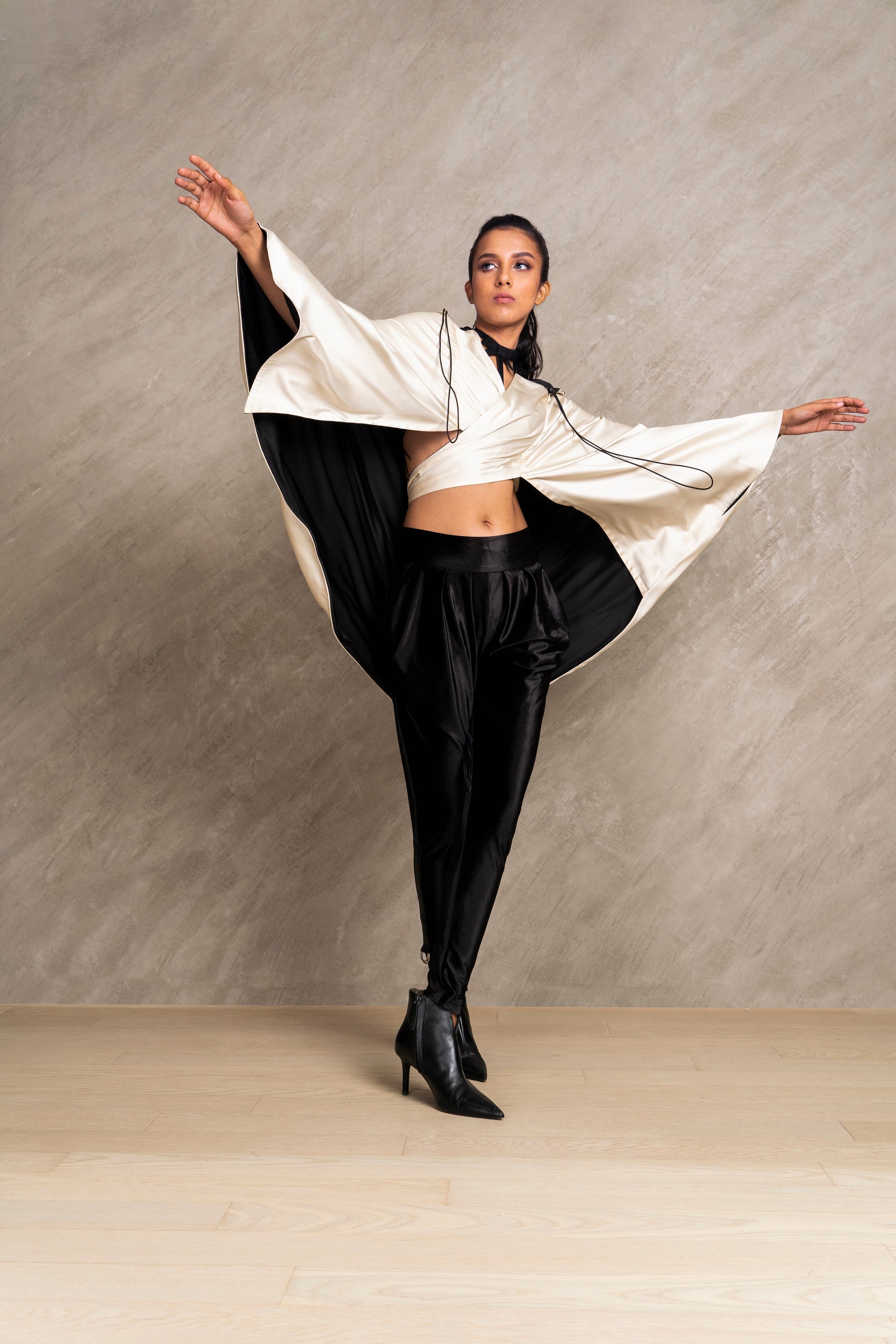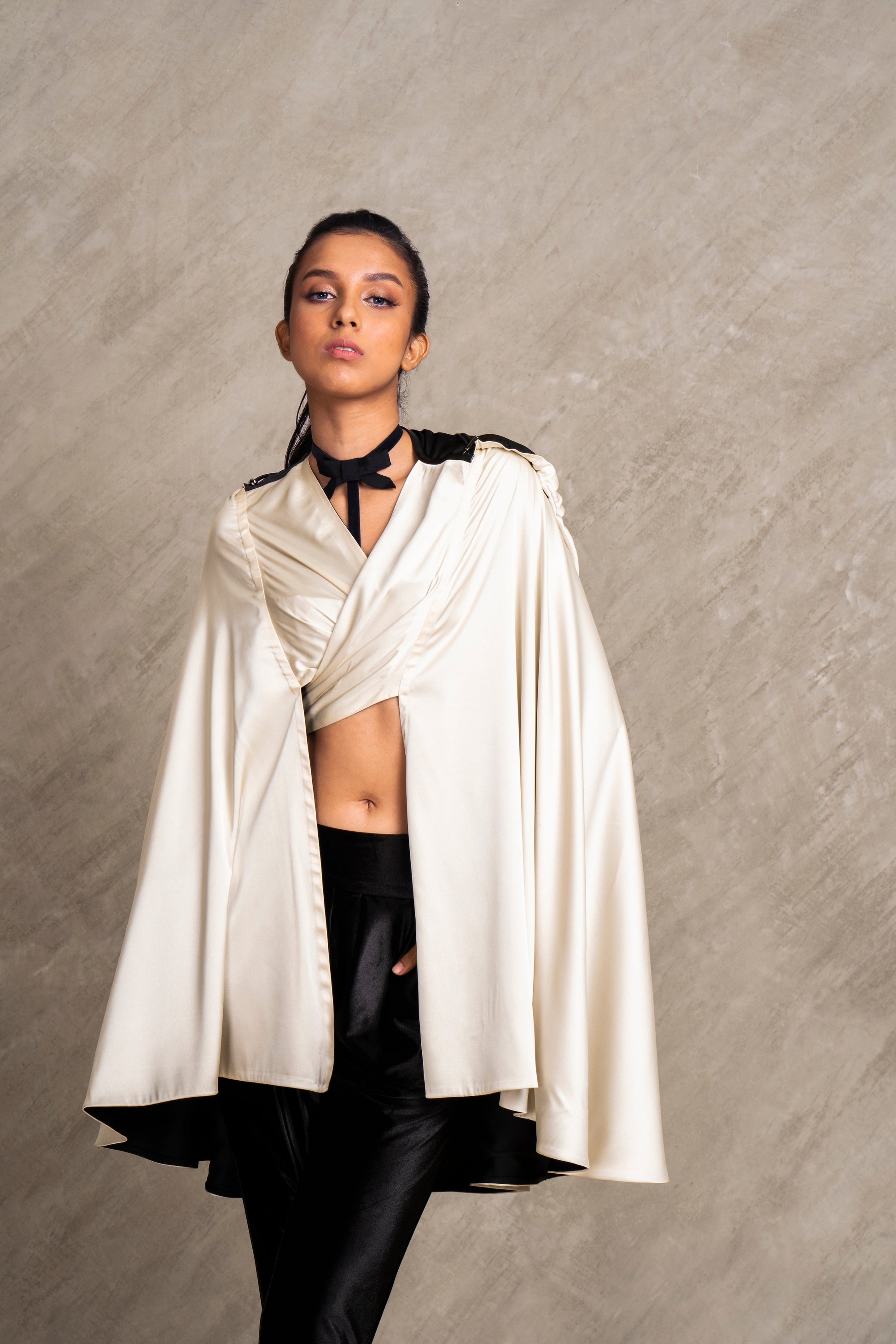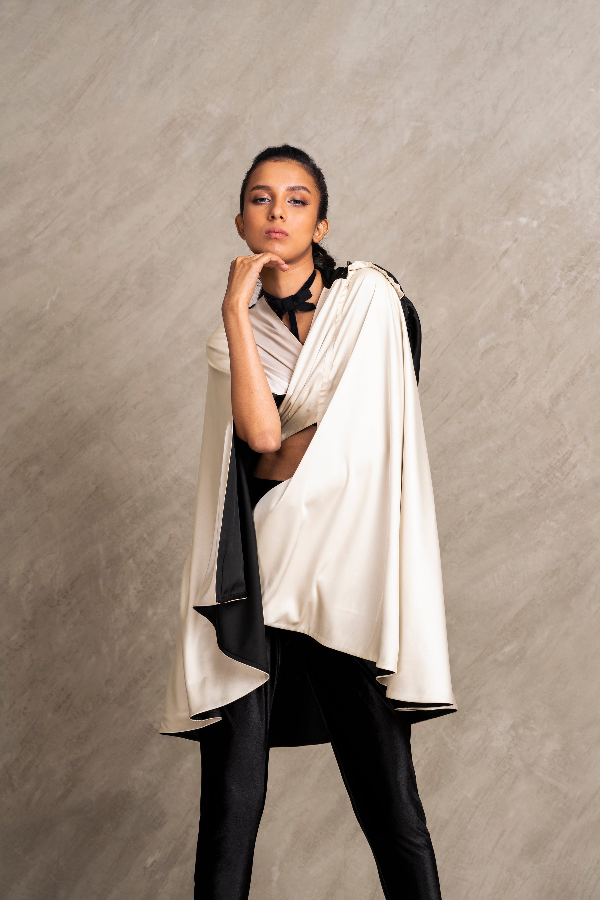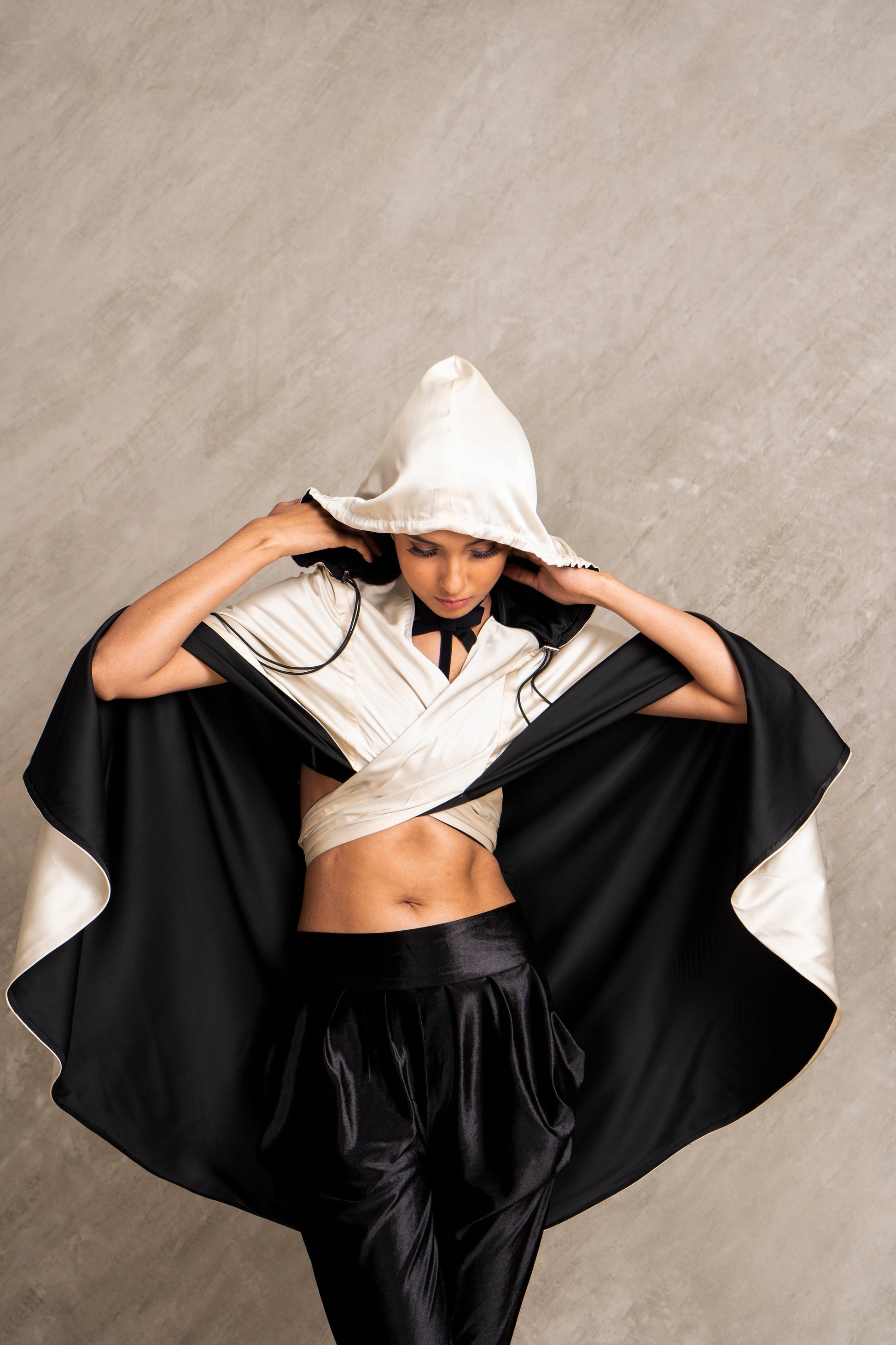 Glam up in our versatile cape with overlap pleated detail with metal loop fastener at the back to adjust to your bust size. The dual tone statement piece is lined with black satin and a hoodie with adjustable elastic string and fastener