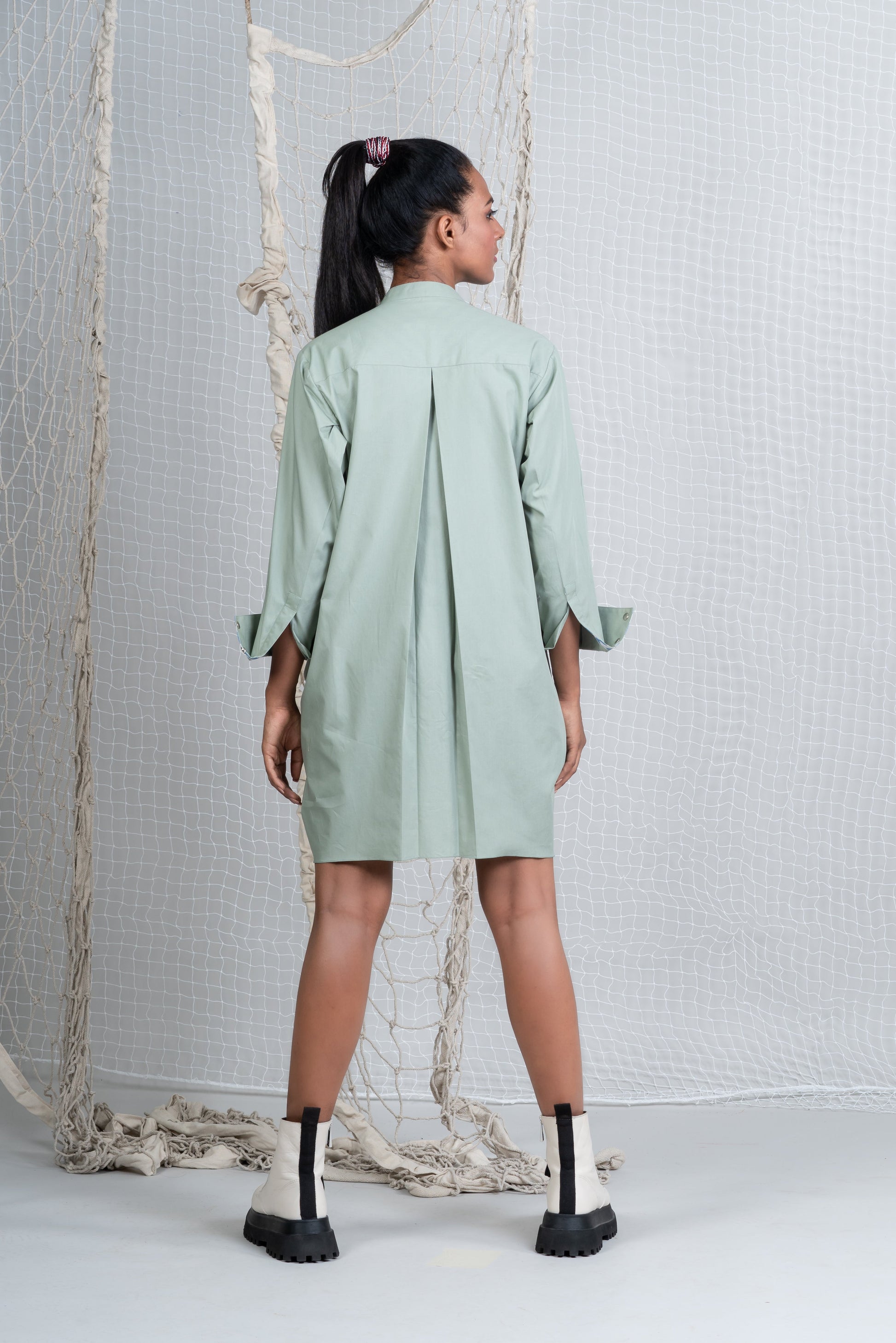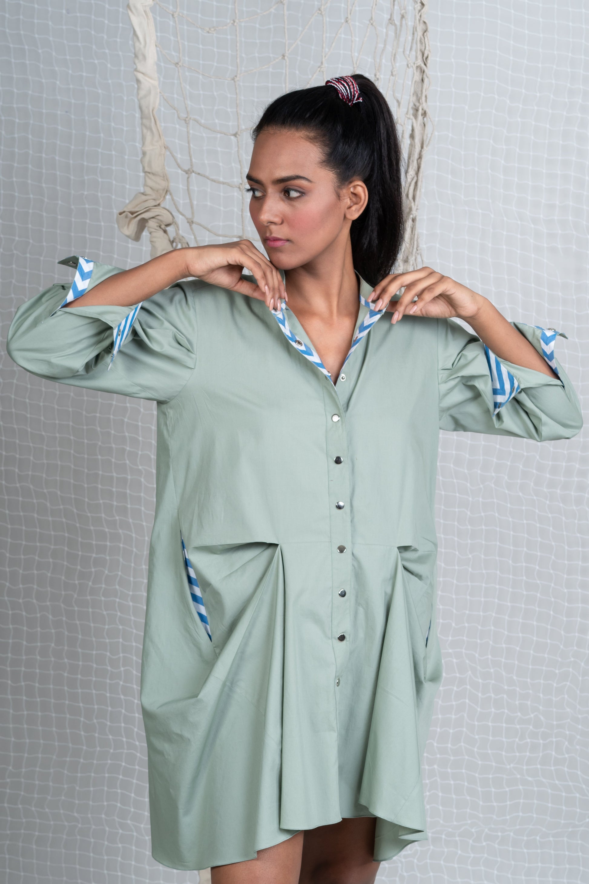 Modern chic dress with a round band collar, box-pleat drape at the waist, golden button closure, chevron cuff detail, and side pockets.