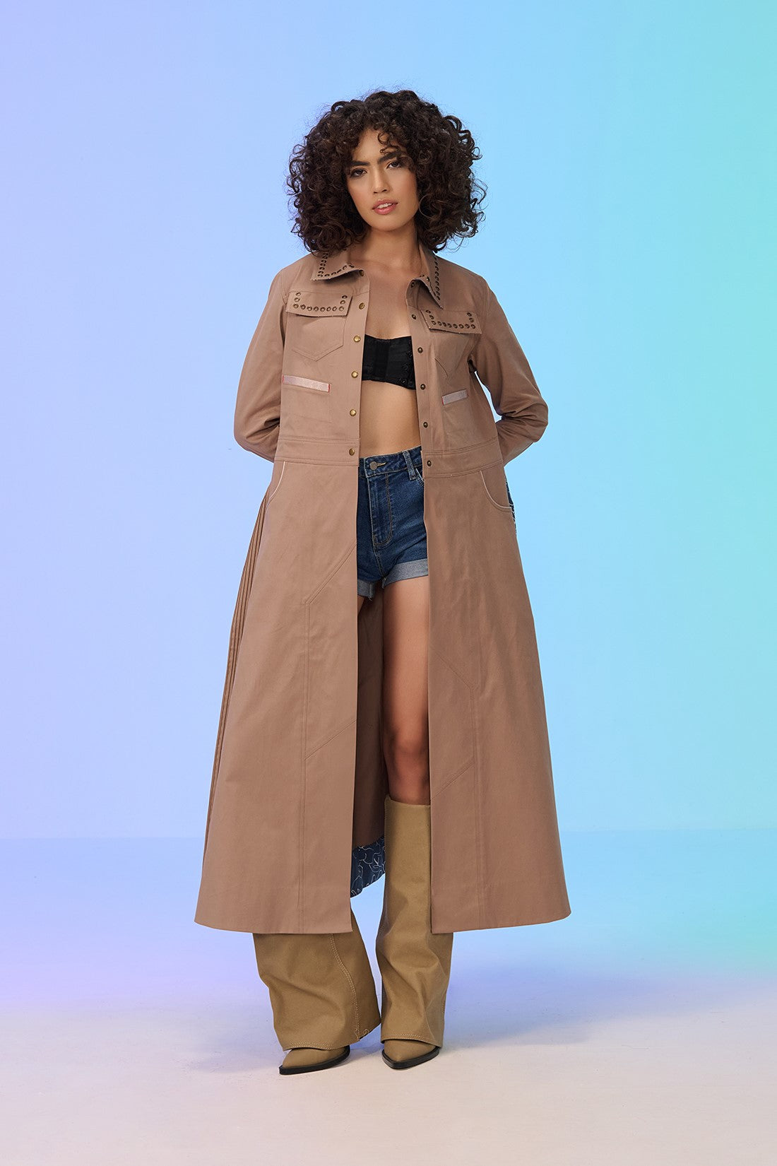 Smart Trench coat with embroidery inspired by pop culture. The trench embodies free spirited aesthetics that mixes different trims and details into an eclectic style.