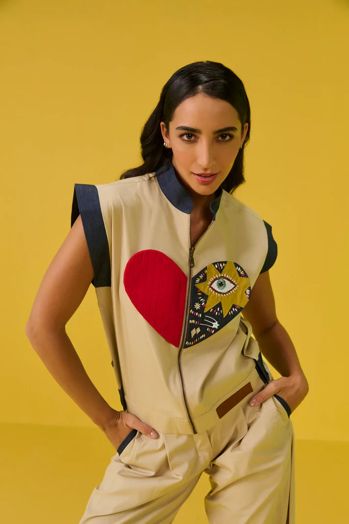 Step into effortless style with this eye catching top that combines classic tailoring with unique touches. The standout feature is the innovatively positioned embroidery on the front bodice. Adding a playful twist, the top is accented with distinctive bottle cap detailing along the edges of the side seam. Pair it with our Bean trousers to complete your look.