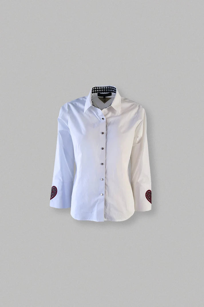 A twist to the classic white shirt, this piece features an inverted cuff with slits and handmade riveted heart patch on both cuffs.