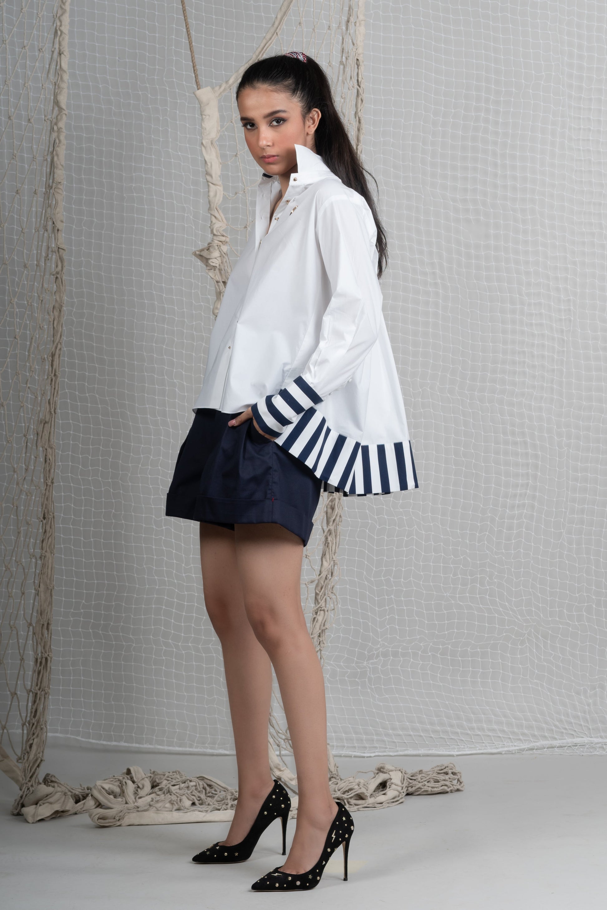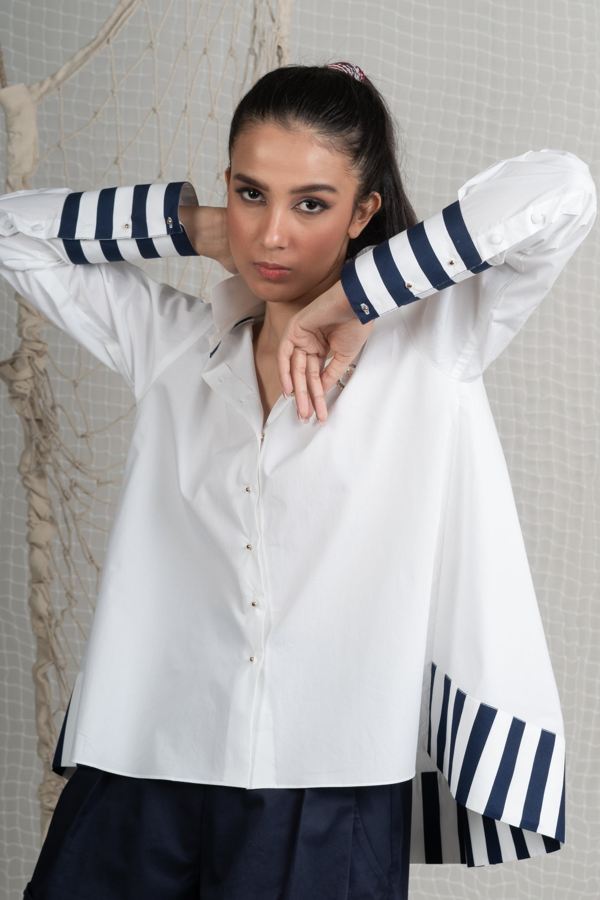 Well tailored white shirt with golden buttons, oversized Navy striped hem & cuff with pleats at the back for a flowy and flare silhouette