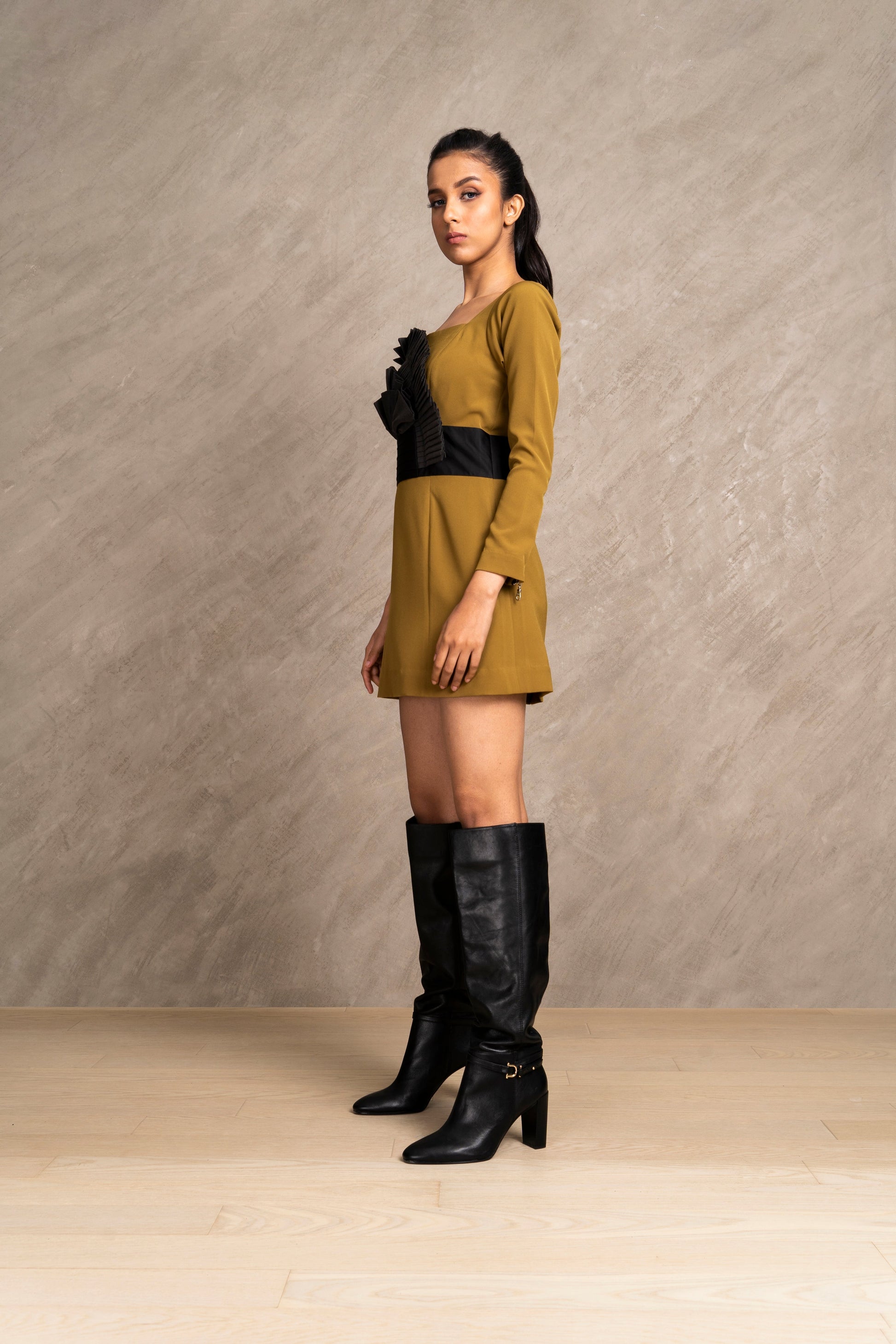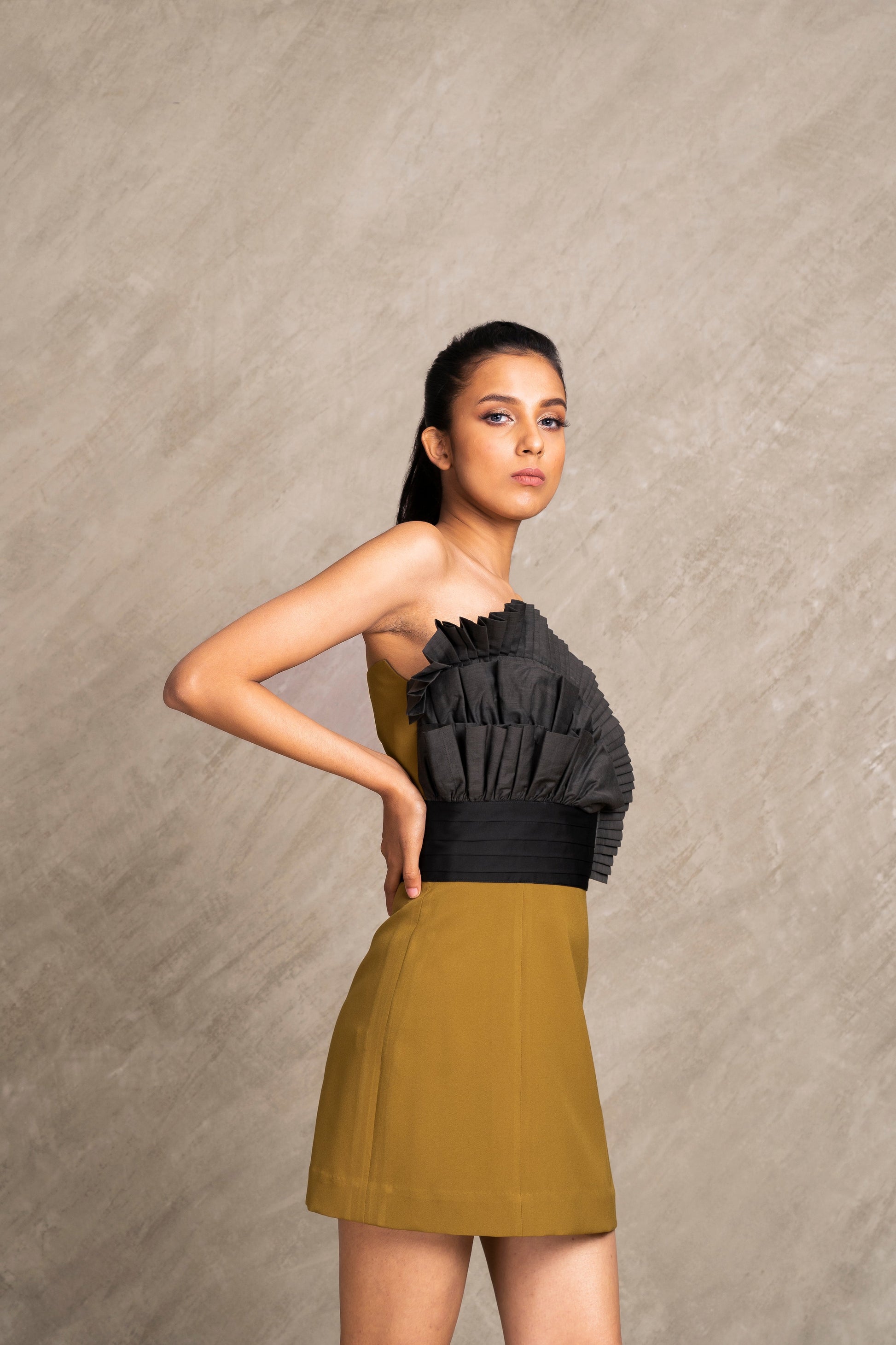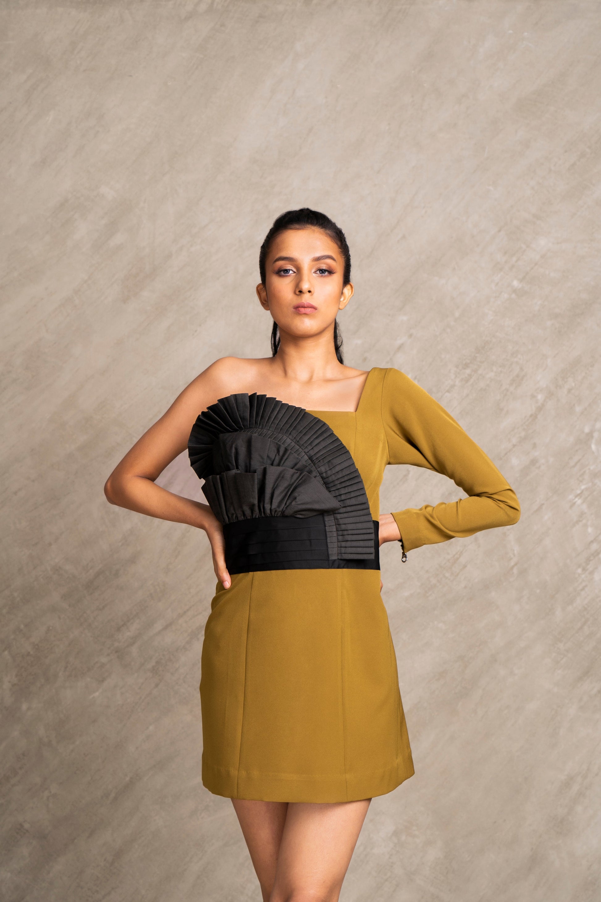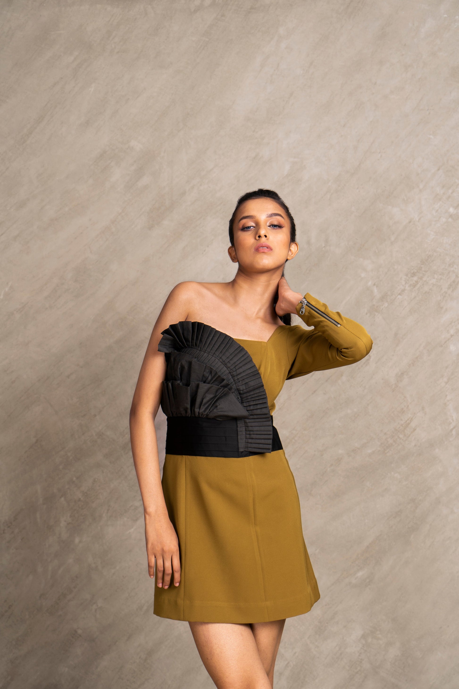 Slay your fashion game in our one piece off shoulder dress, impeccably crafted with fabric manipulation on the front and a satin cummerbund detail on the waist, completed with metal zipper at the back from top to bottom for that edgy vibe.
