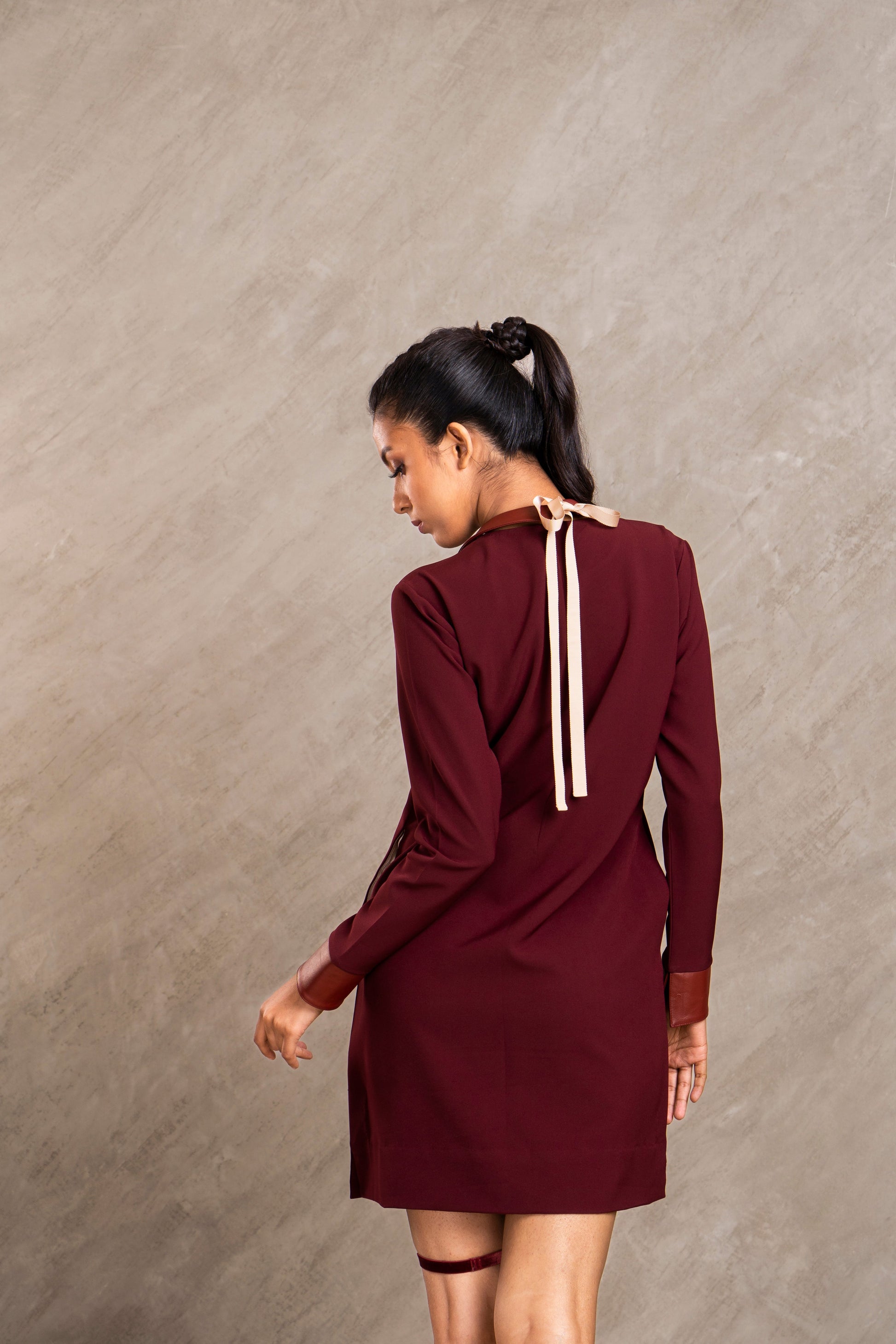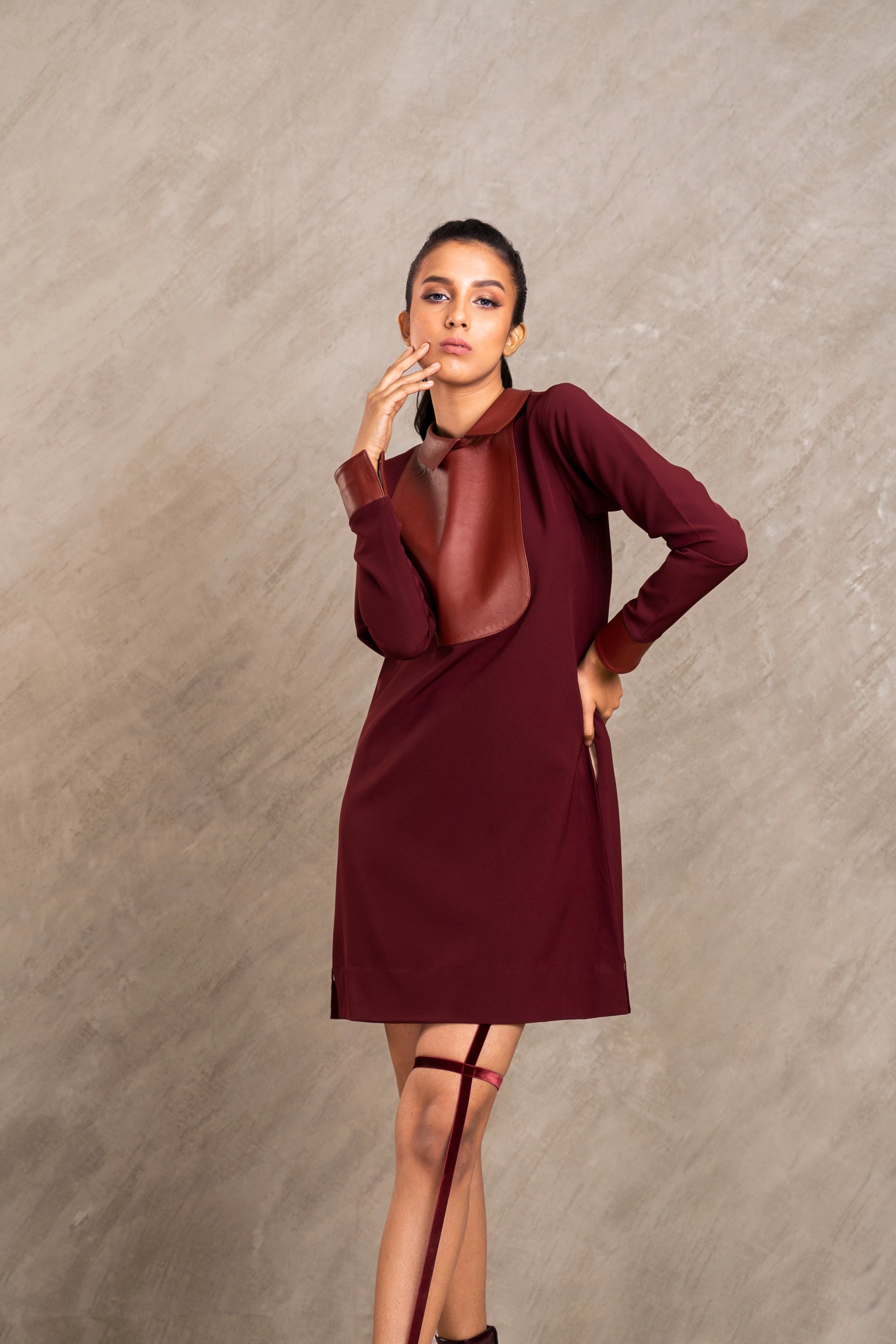 Lucy is a classic and smart dress with leather yoke and detachable leather collar fastened with beige tie up ribbon; luxurious cream satin lining the side pockets and mini slits on the side, finished off with beige lacing on the inside
