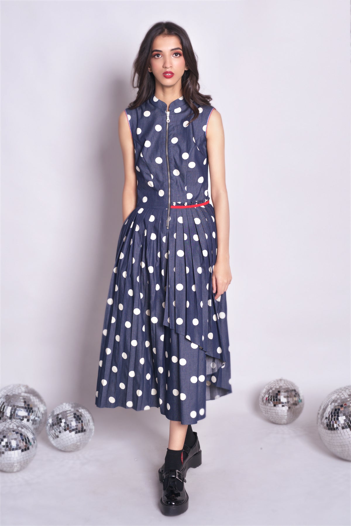 - Sleeveless dress in polka dot denim with stand round collar and front zip opening
