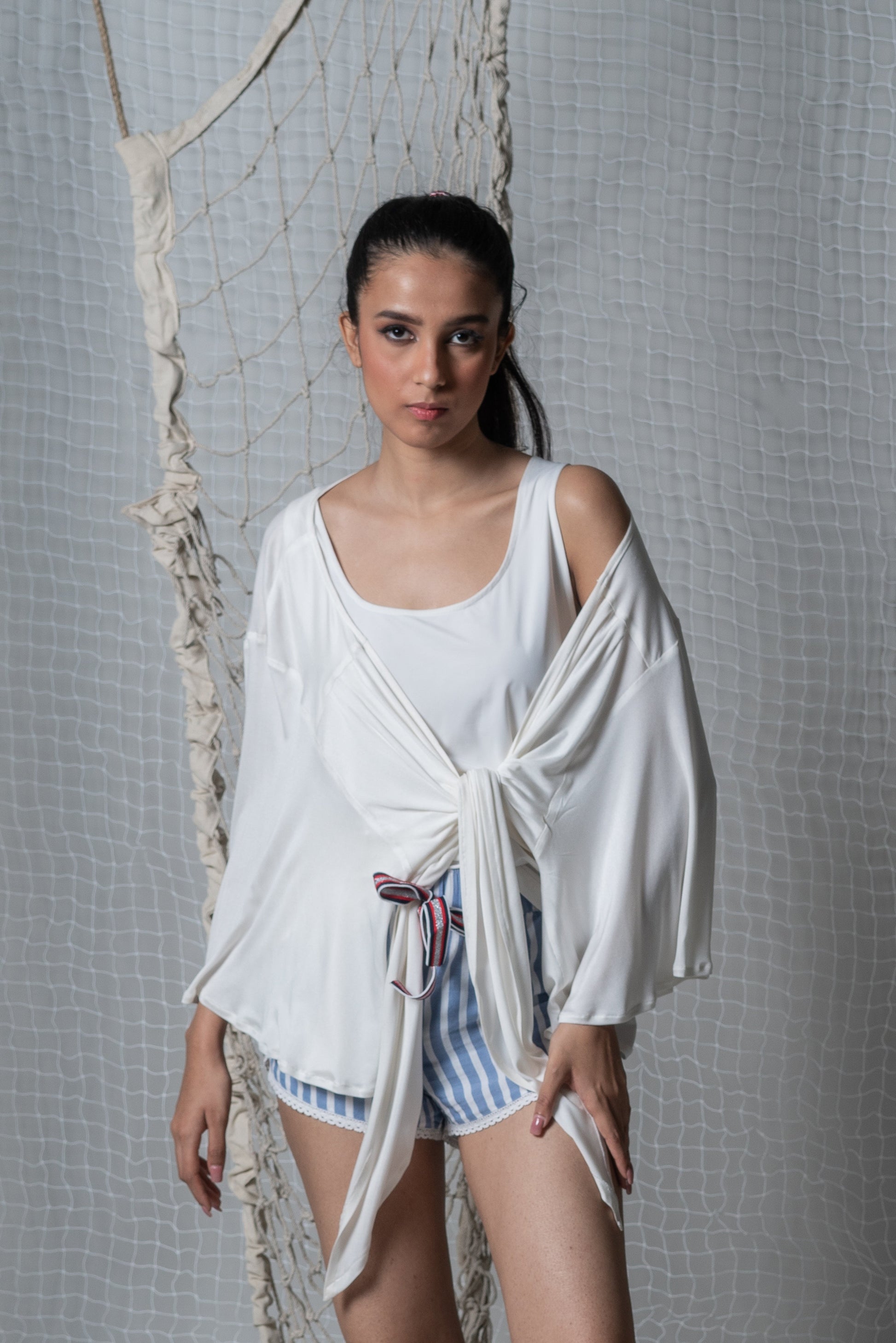 Wrap up top with drop shoulders and elbow length butterfly sleeves.