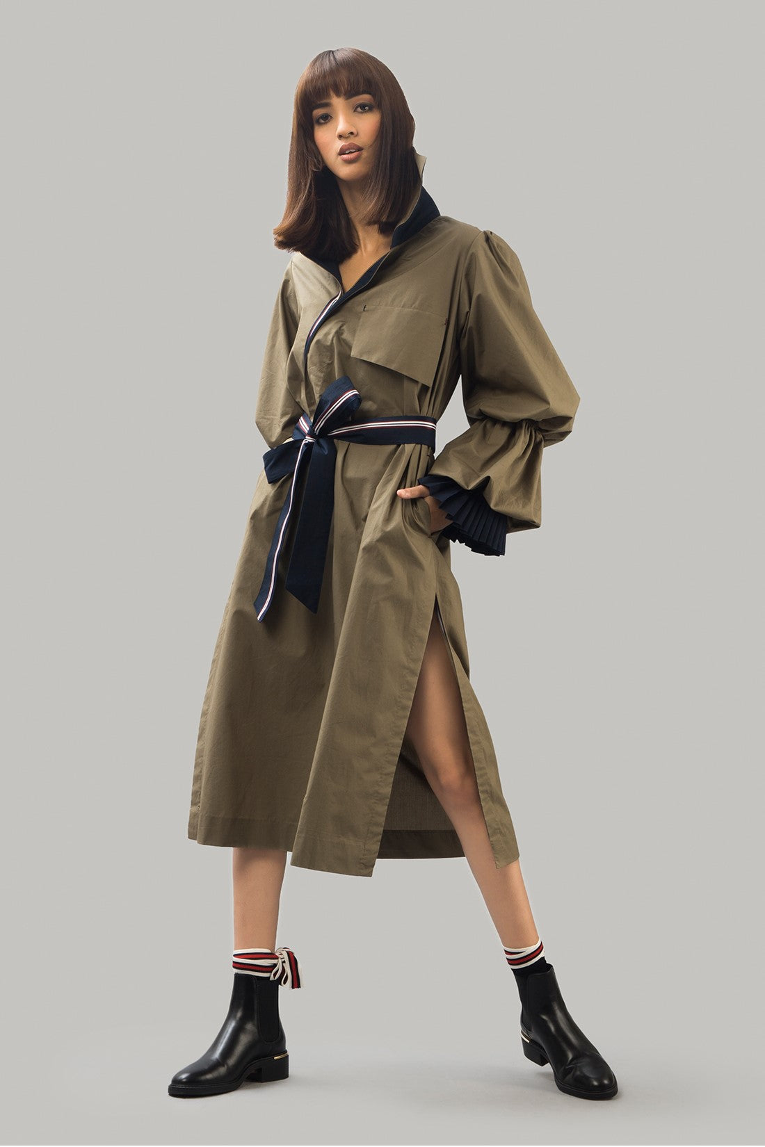 Long trench dress with statement puffed sleeves with wraparound tie belt and large front pockets