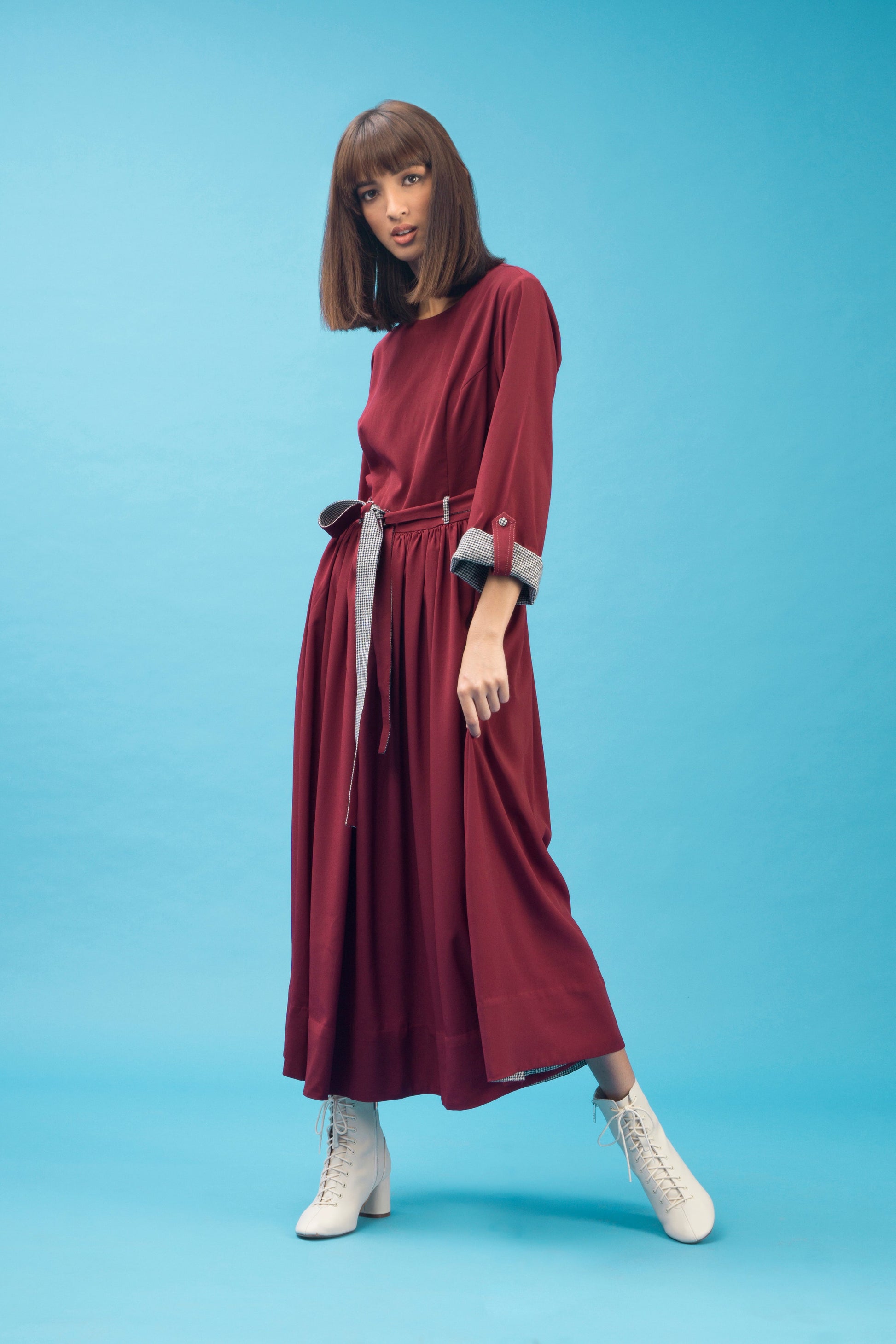 A long relaxed fit dress with folded check facing sleeves and tie front belt