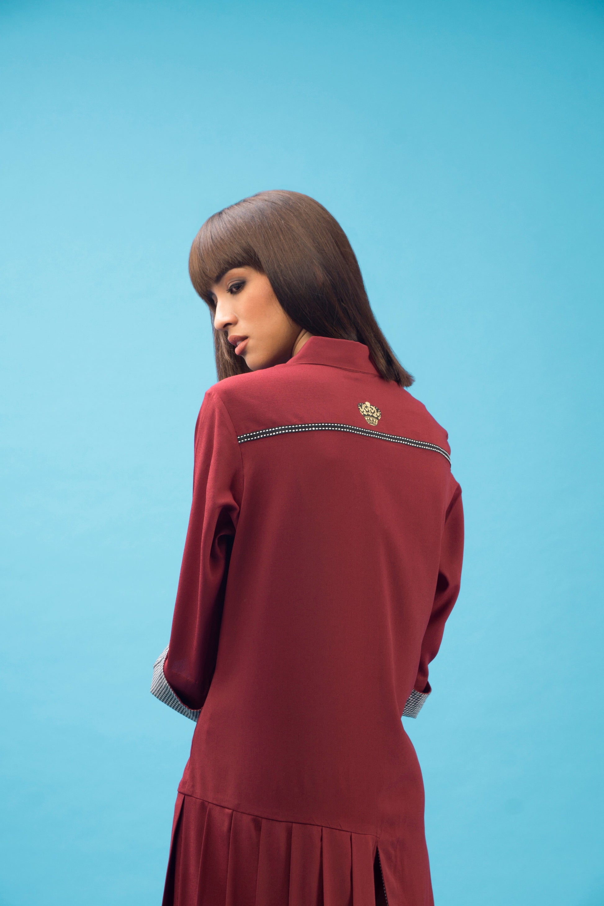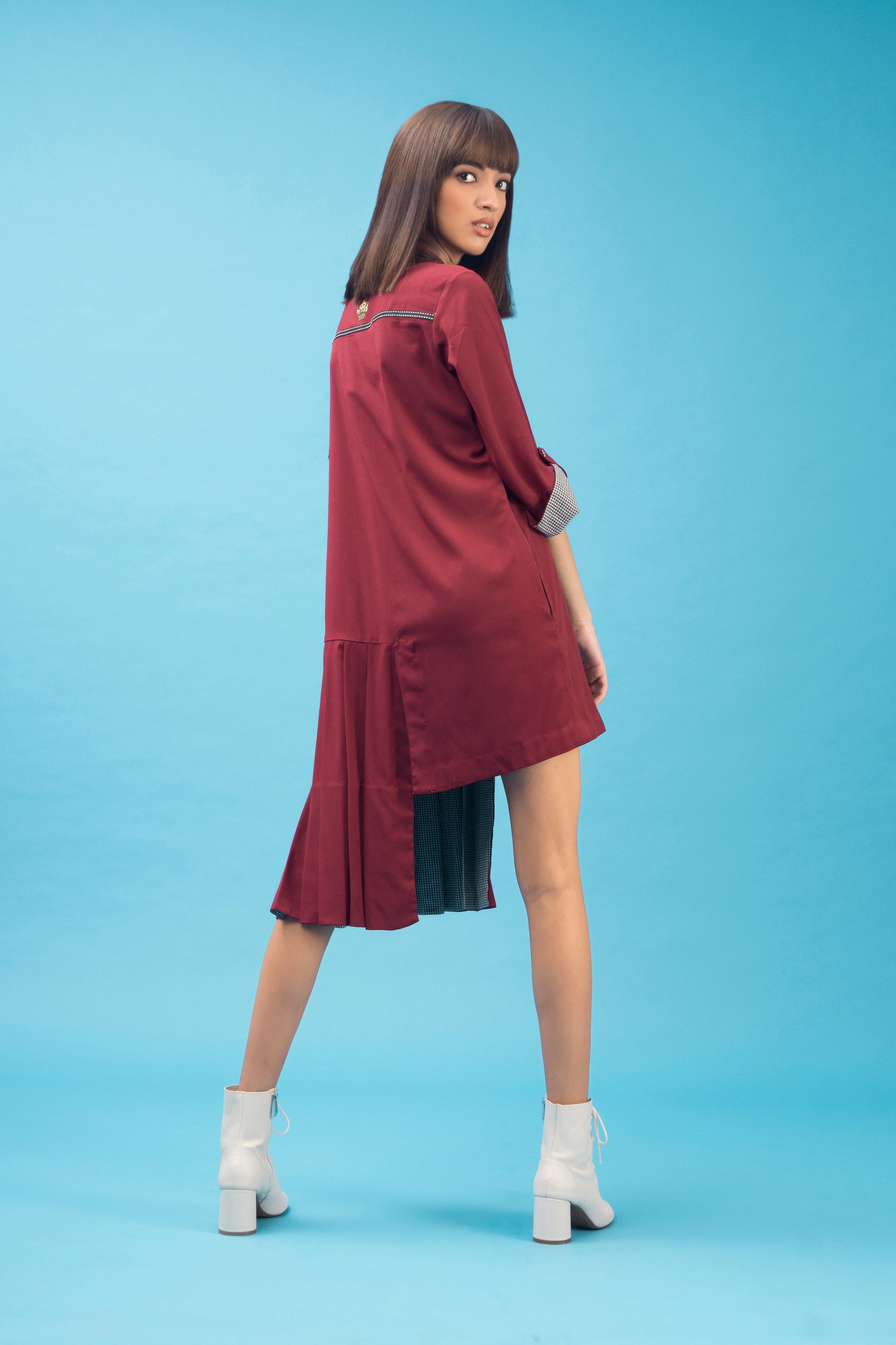 An asymmetrical cut shirt dress with pleat details which has three quarter folded sleeves detailed with check facing and handmade buttons