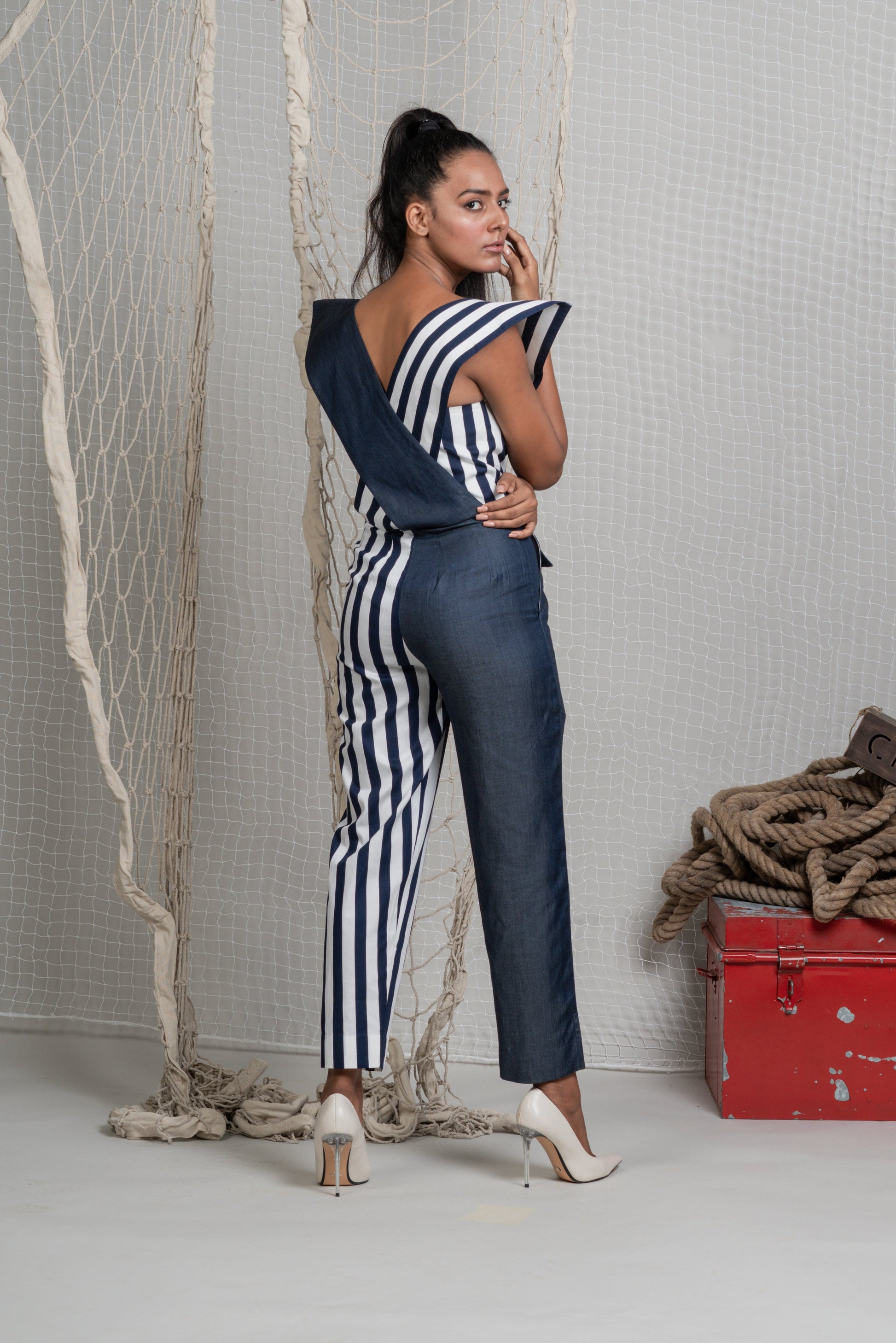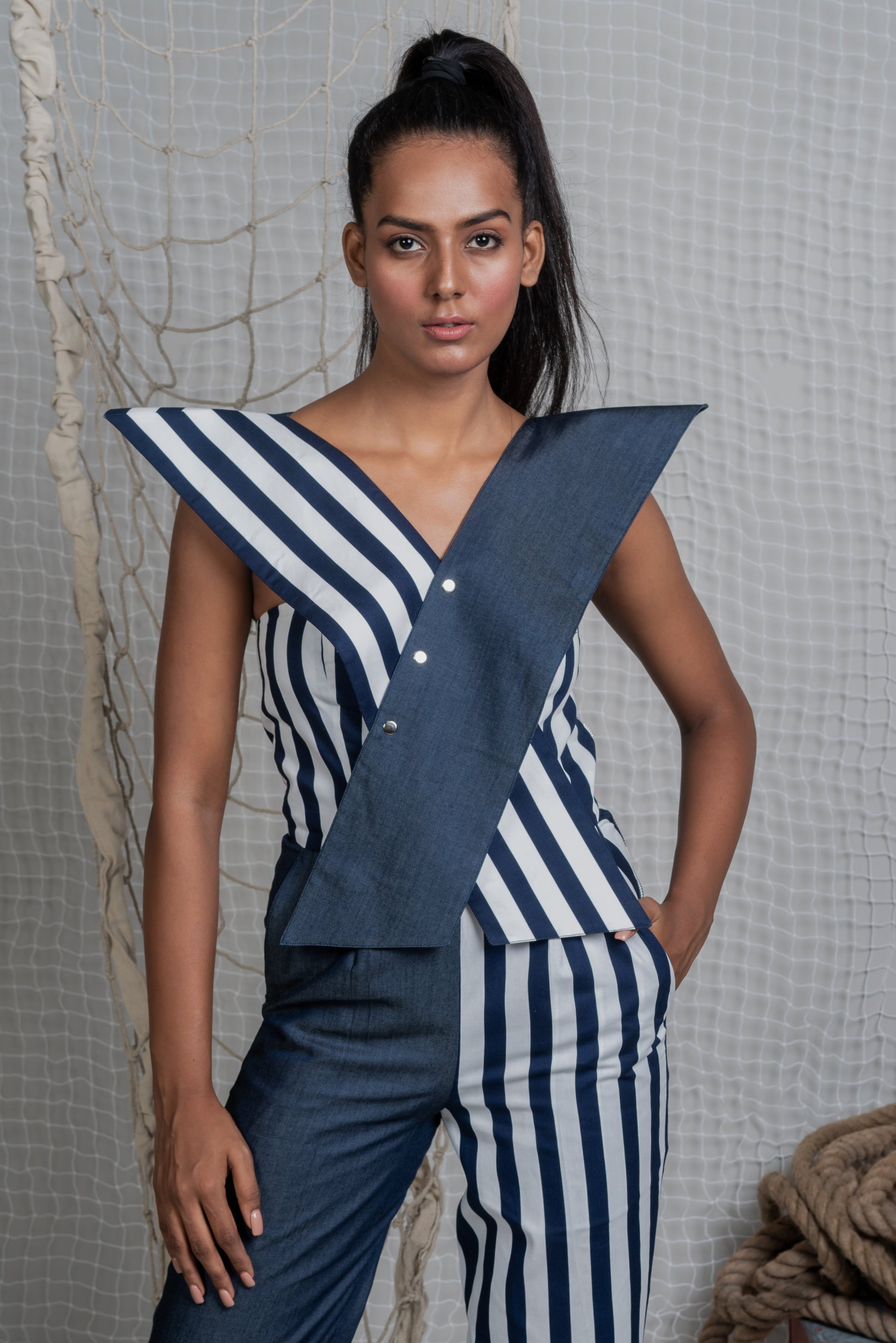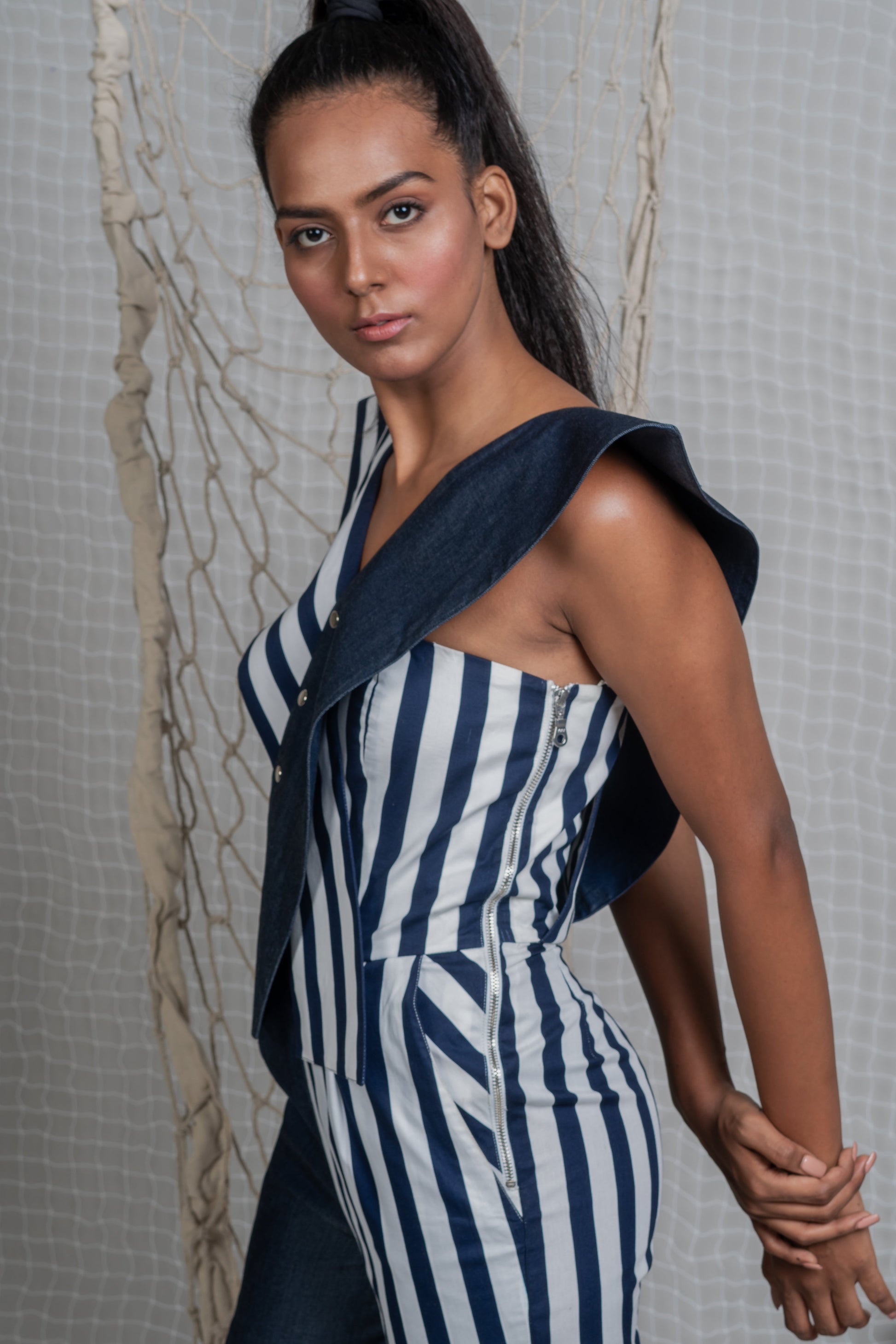 Statement jumpsuit in Denim and Navy white stripes, corset body fit with crossbody shoulder lapels, metal zip on the sides and front snap buttons for ease of fit
