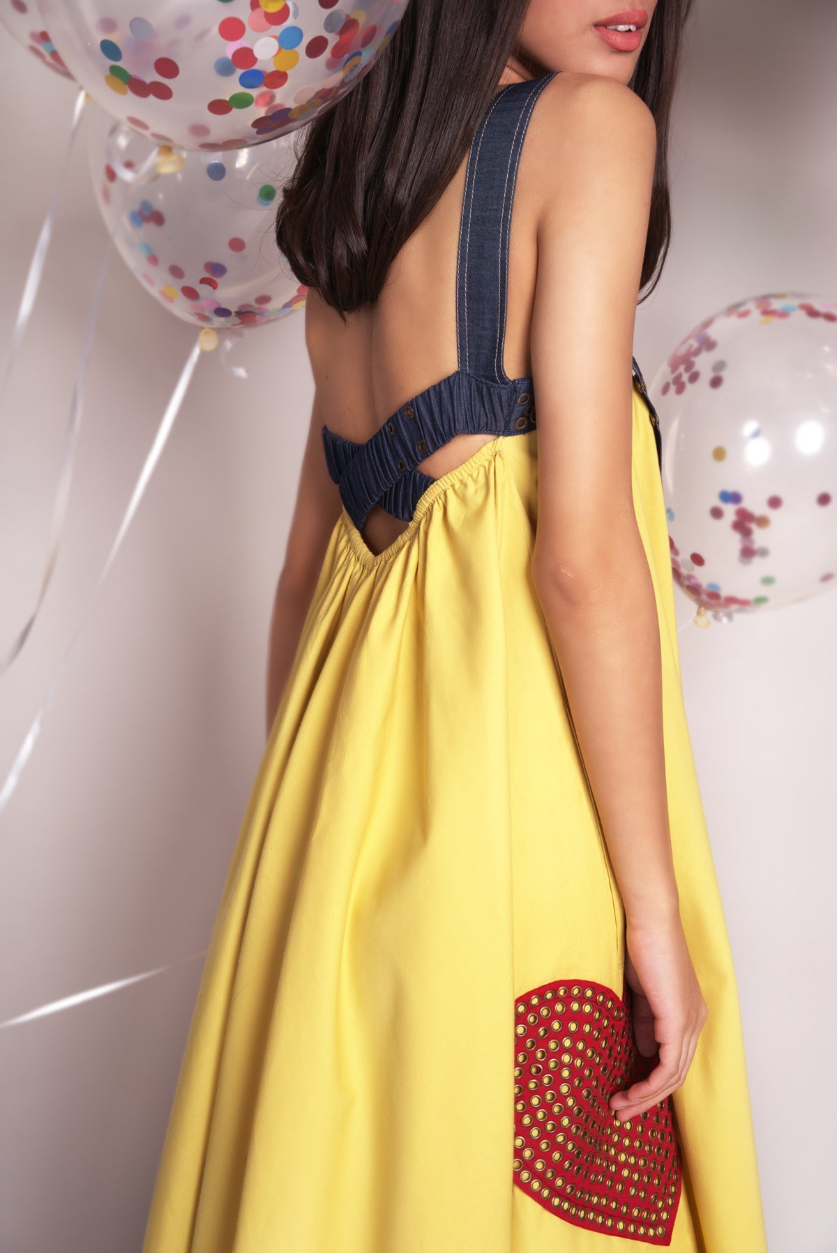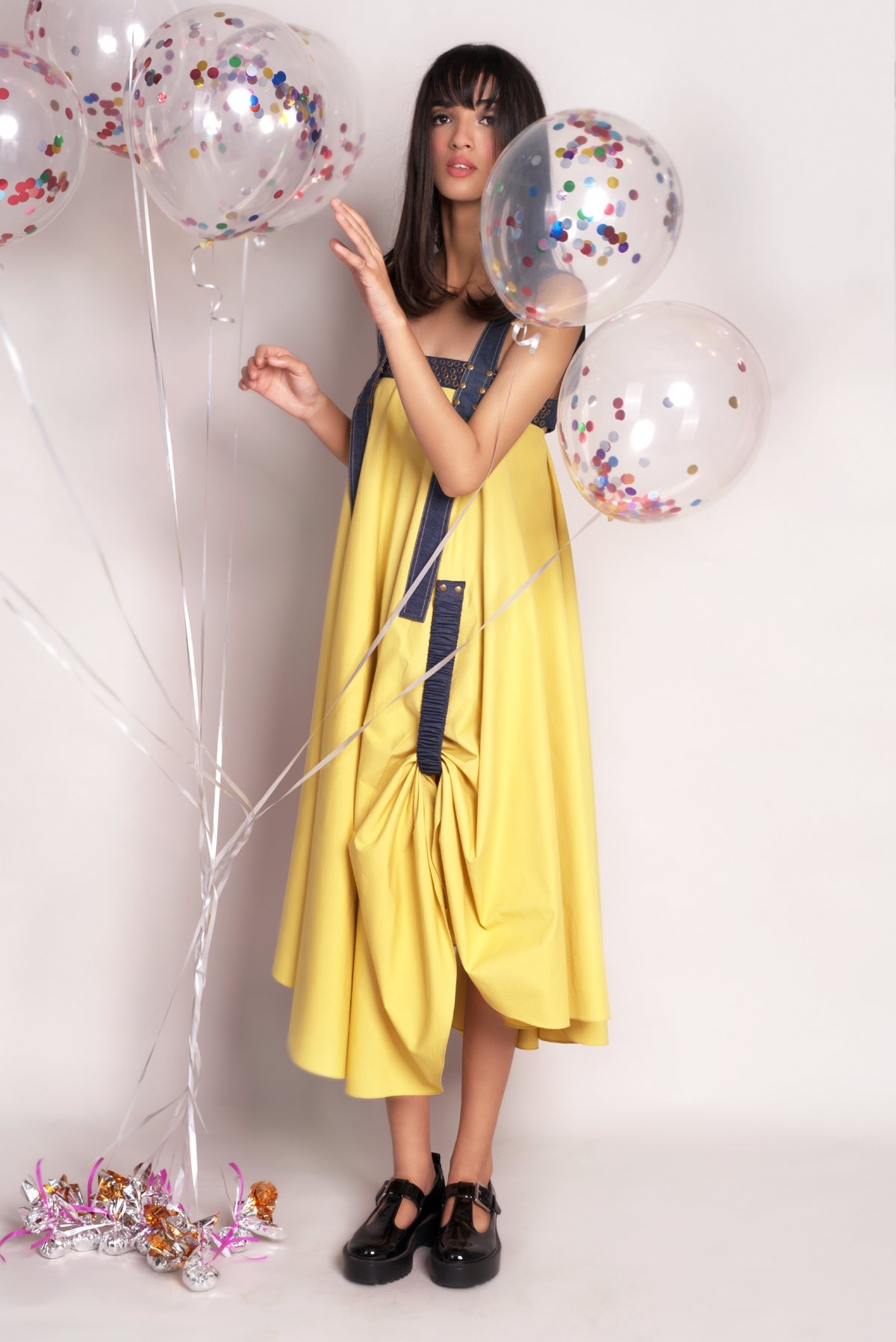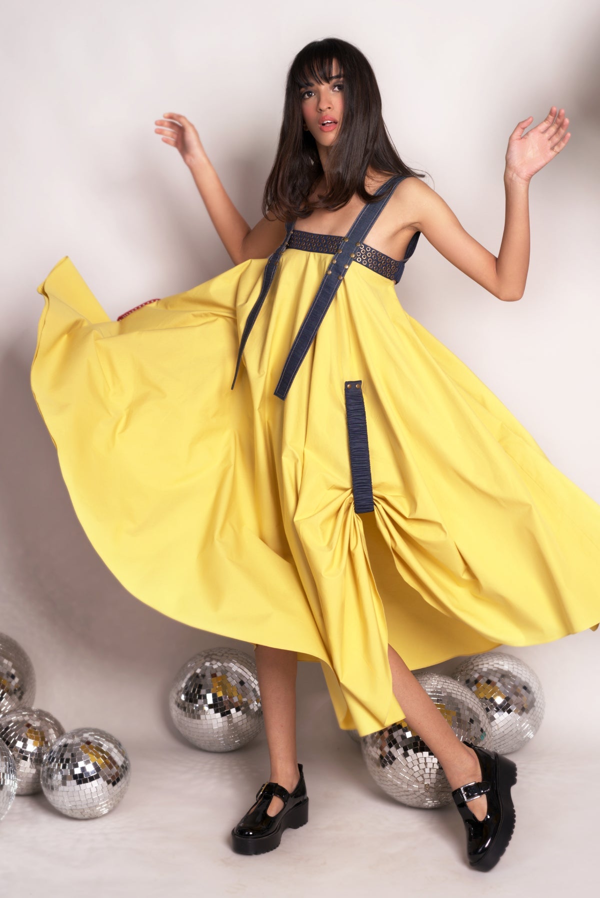 - Maxi parachute dress with denim studded straps and crossback ruched details