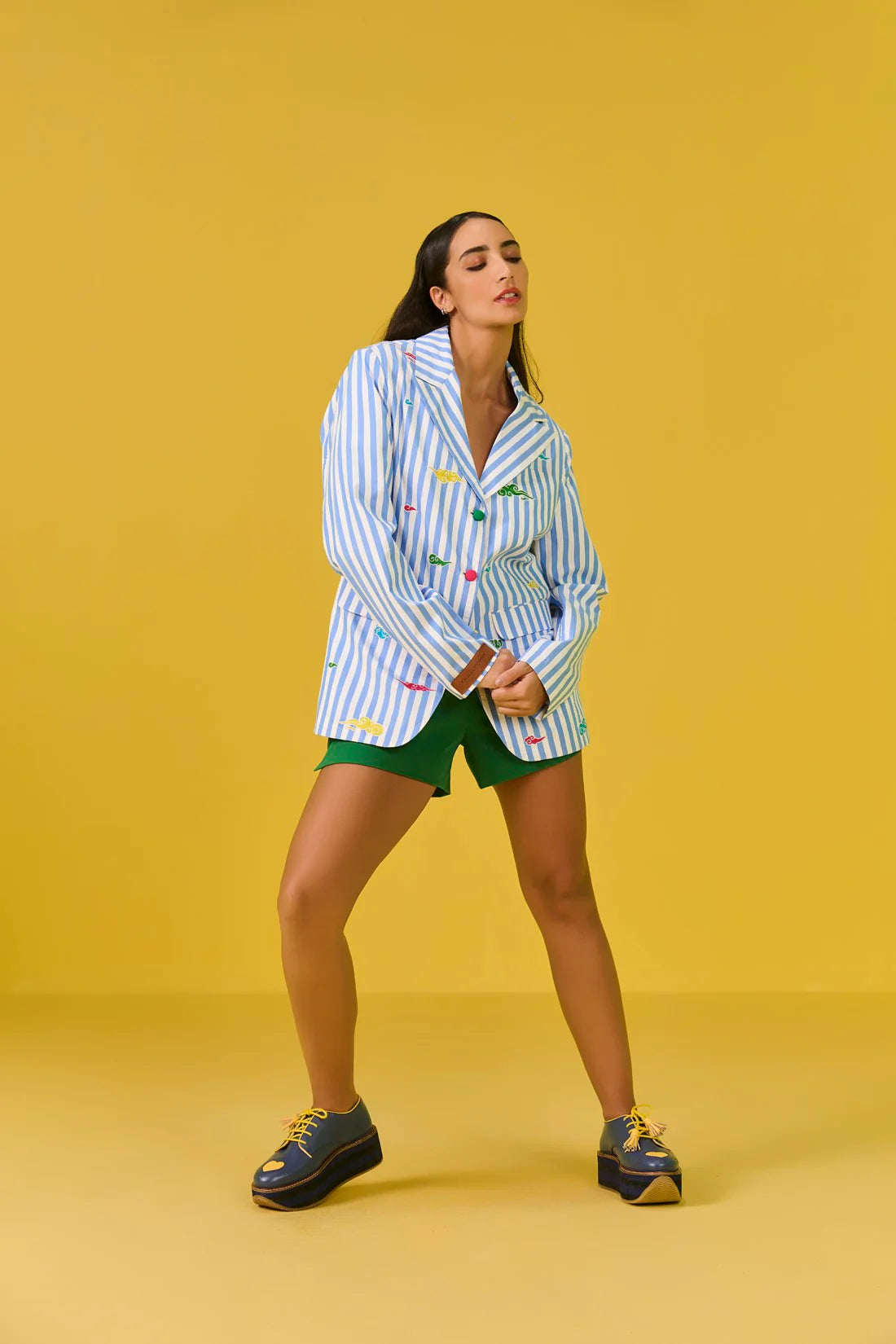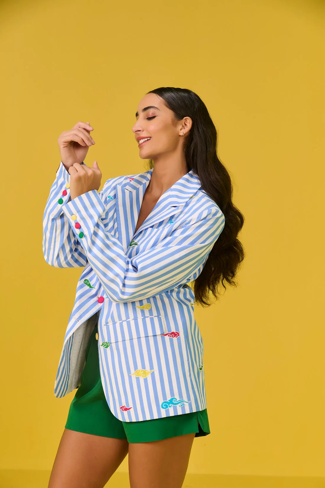 Make a statement in this oversized blazer drenched in bold stripes that instantly uplift any look. Playful, quirky clouds in a riot of colours are embroidered all over, adding a whimsical twist to classic tailoring. With its relaxed fit and unexpected detailing, this blazer is your ticket to effortless cool- wear it and brighten up the greyest day.