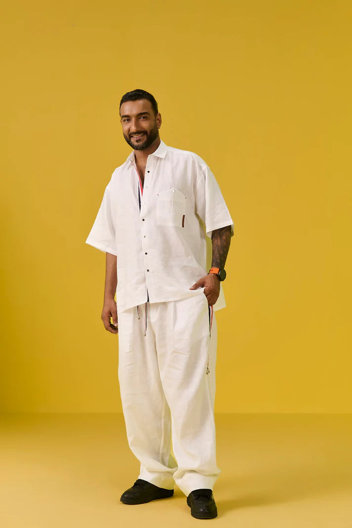 Cut in a relaxed fit adjustable drawstring and elastic waistband, the trousers feature classic side seam pockets. A distinctive lace panel and a sleek -metal buckle interrupt one side seam halfway- introducing a bold accent that sets these trousers apart.