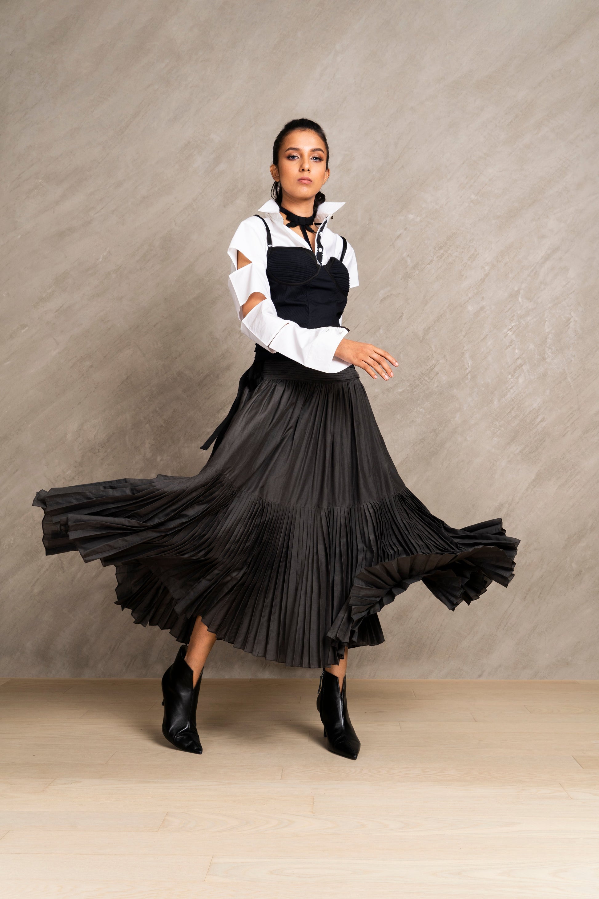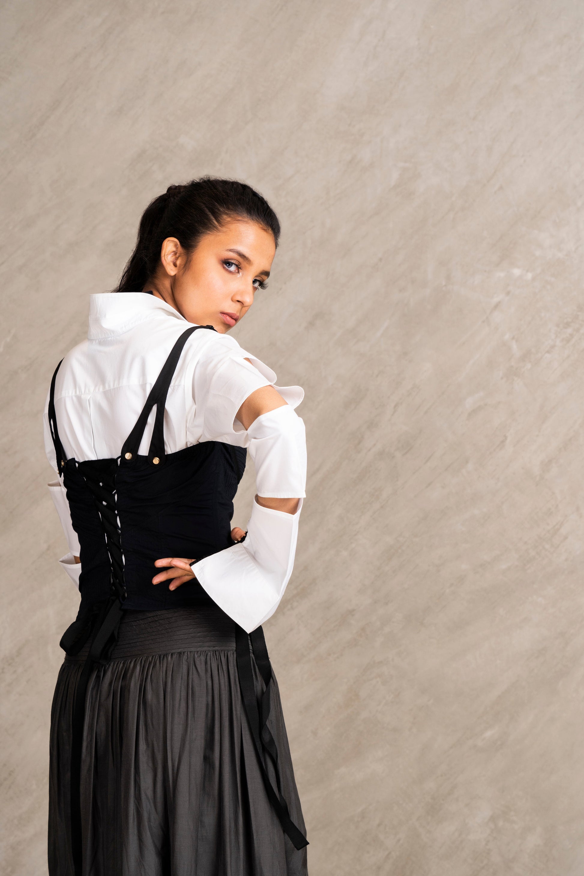 Spice up your modern attire with our black corset designed with cross tie at the back to hug the figure and adjustable shoulder straps with gold buttons for perfect fit. Game up your style quotient by layering the corset over ASTRID JR shirt and Lagantha long skirt