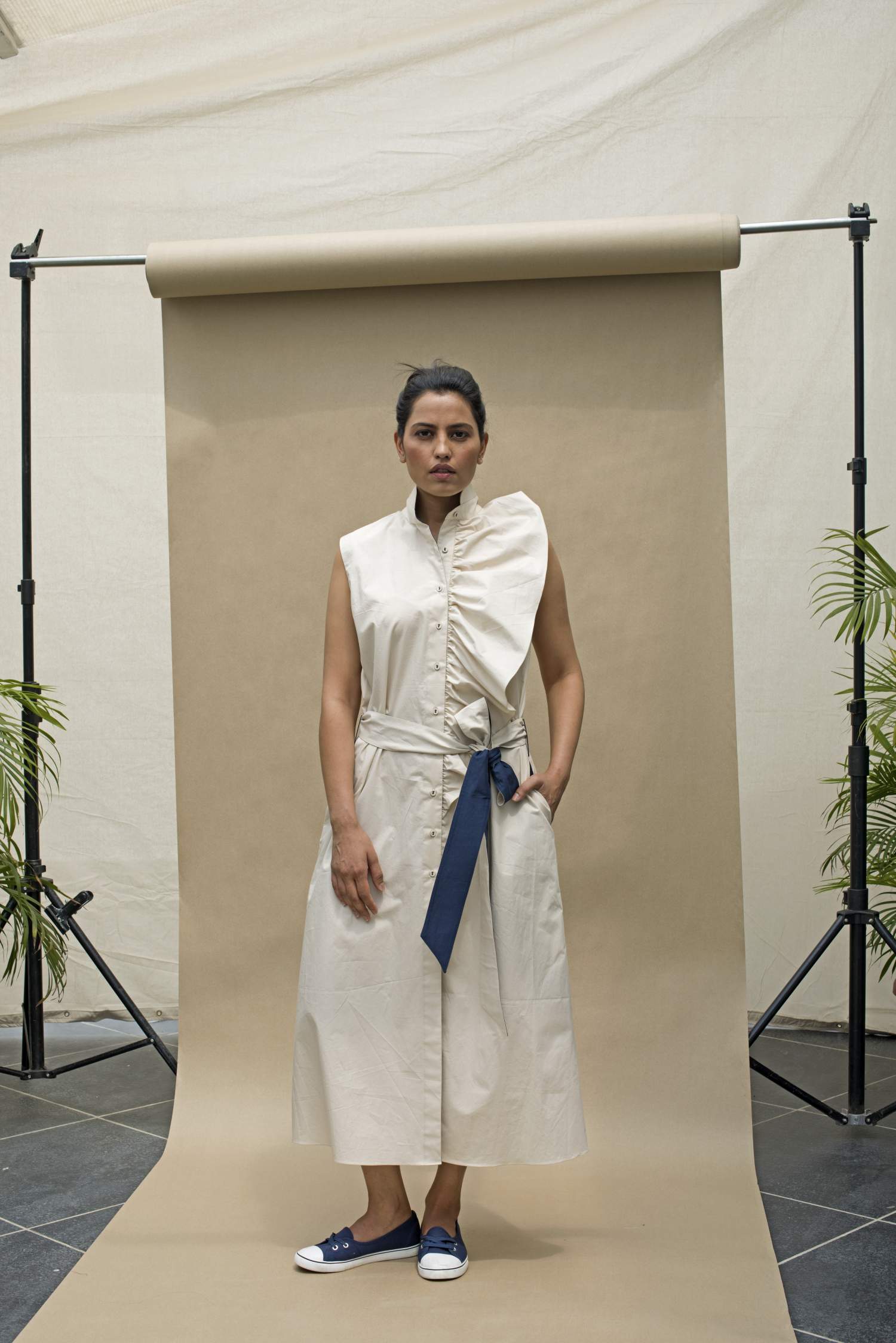 Long dress sleeveless with oversized ruffles, side pockets and origami details at the back
