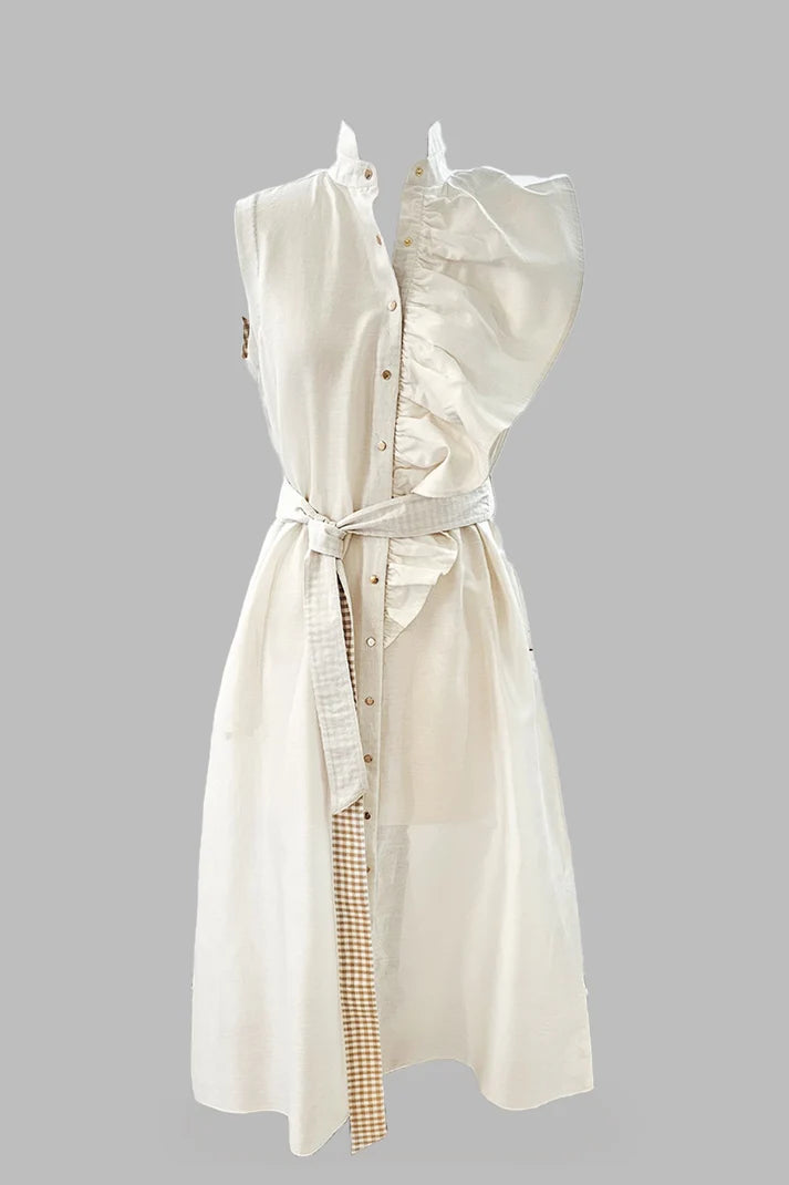 Our favourite dress is here to spread sunshine in the festivities. Long, sleeveless trench style dress in delicate fabric with oversized ruffle. This limited edition features a hand-embroidered sunflower patch to elevate your festive look.