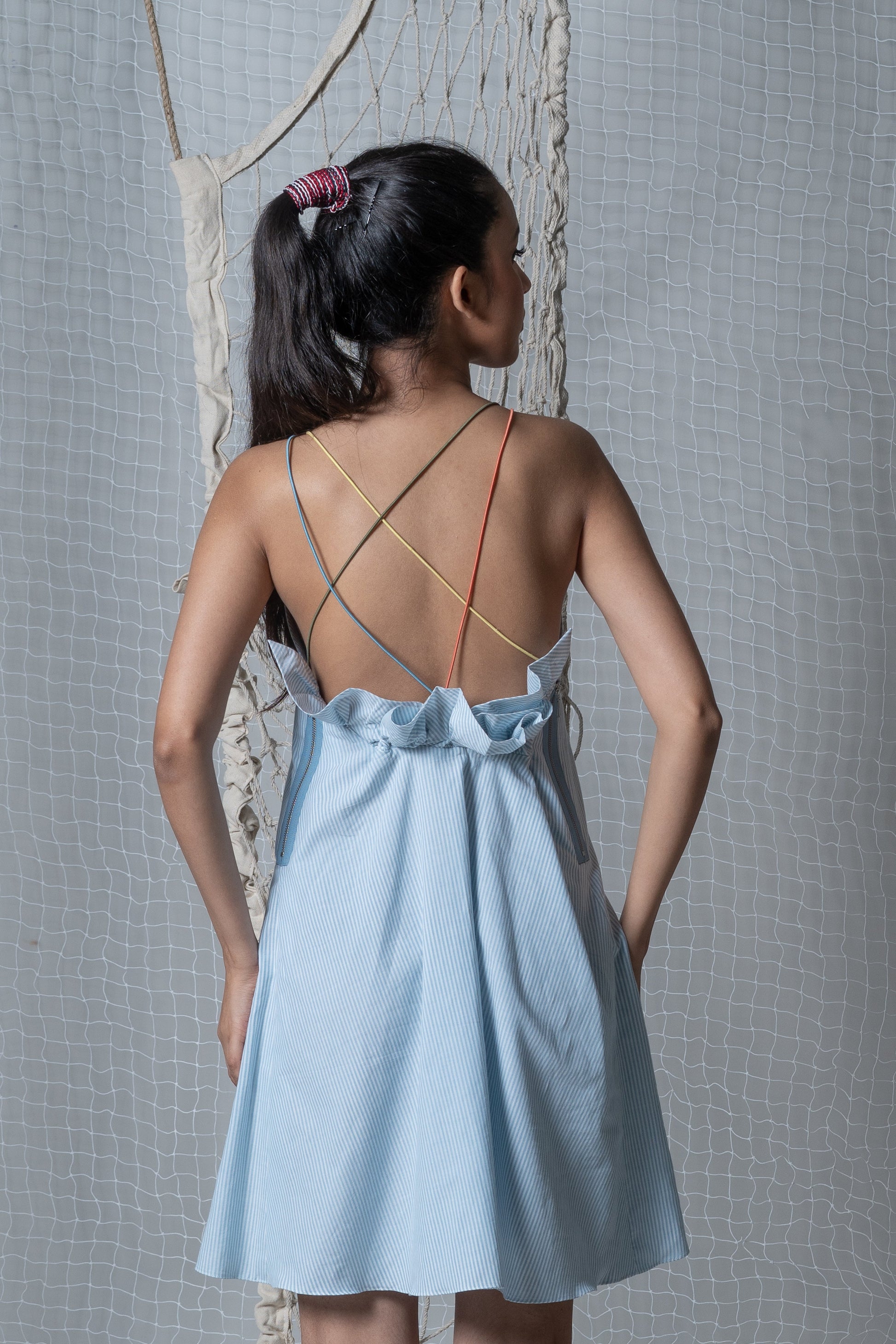Loose strappy A line dress with ruched back, exposed side zips and multi coloured criss-cross strings
