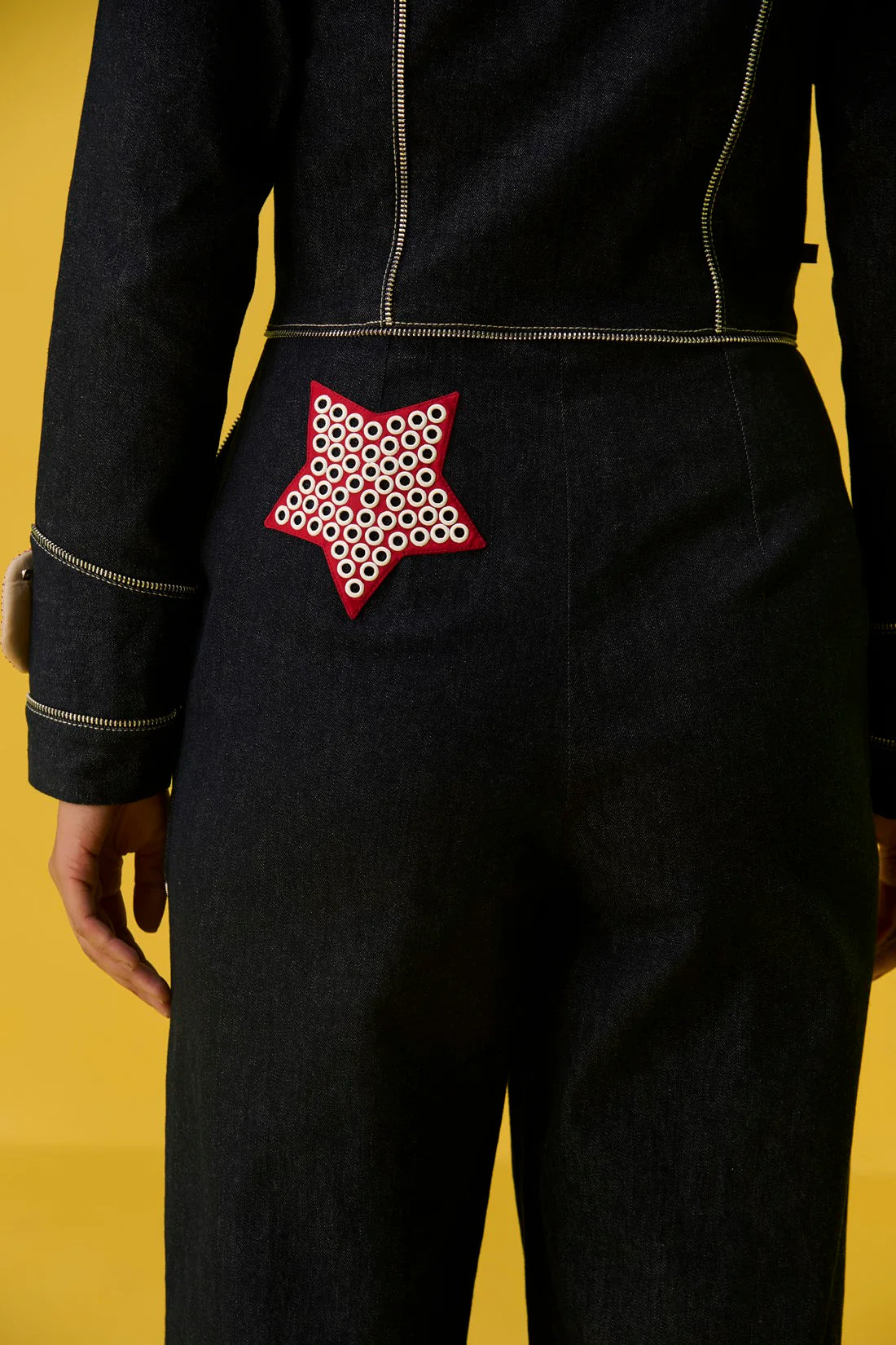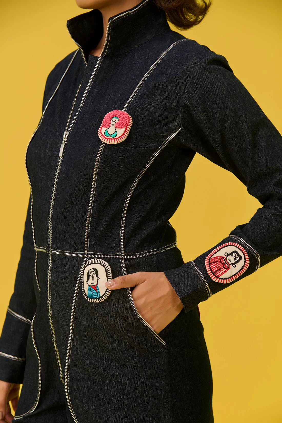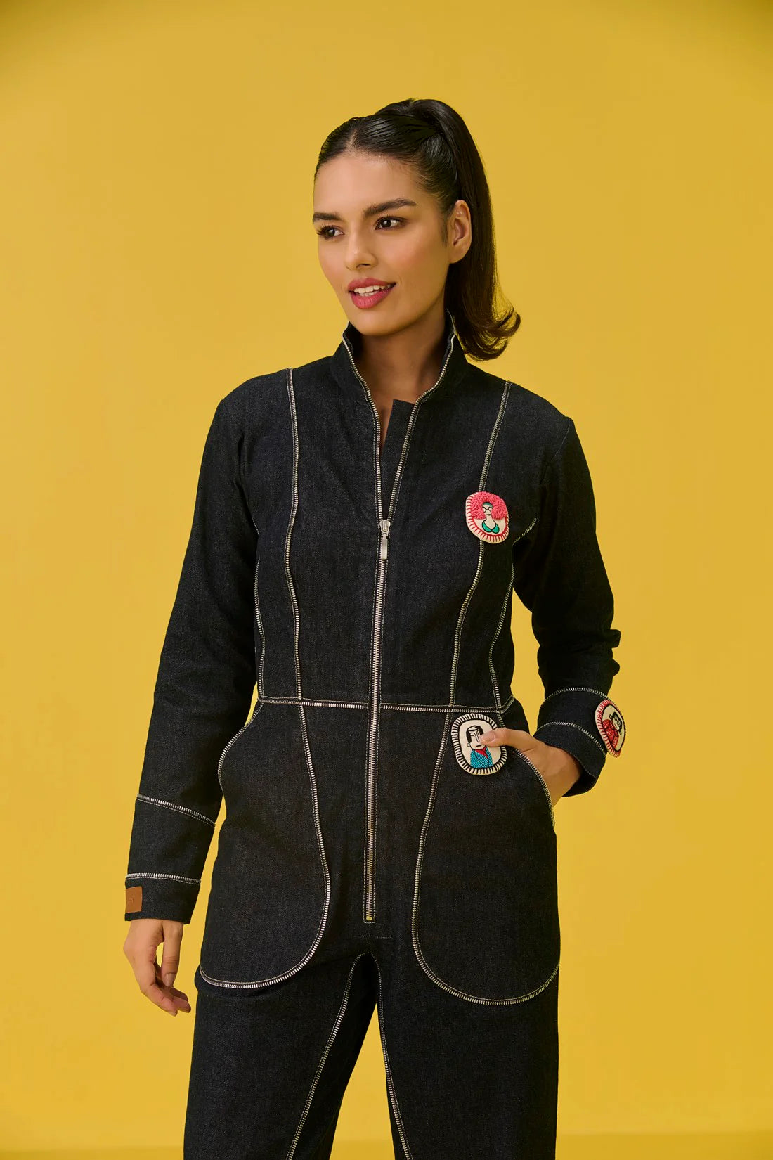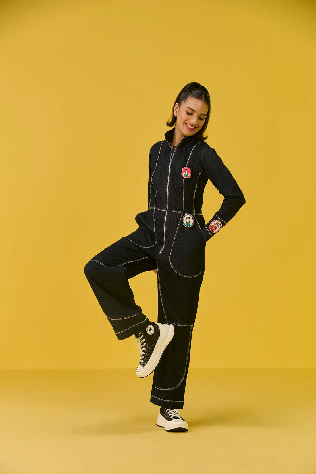 A bold spin on the classic boiler suit, this jumpsuit is built for those who love to stand out. Crafted in sturdy yet comfy denim, the jumpsuit features zip detailing running across unexpected places adding an industrial edge to the piece. The silhouette is relaxed, giving it a utilitarian-cool vibe, while topstitching and structured panels elevate the design.
