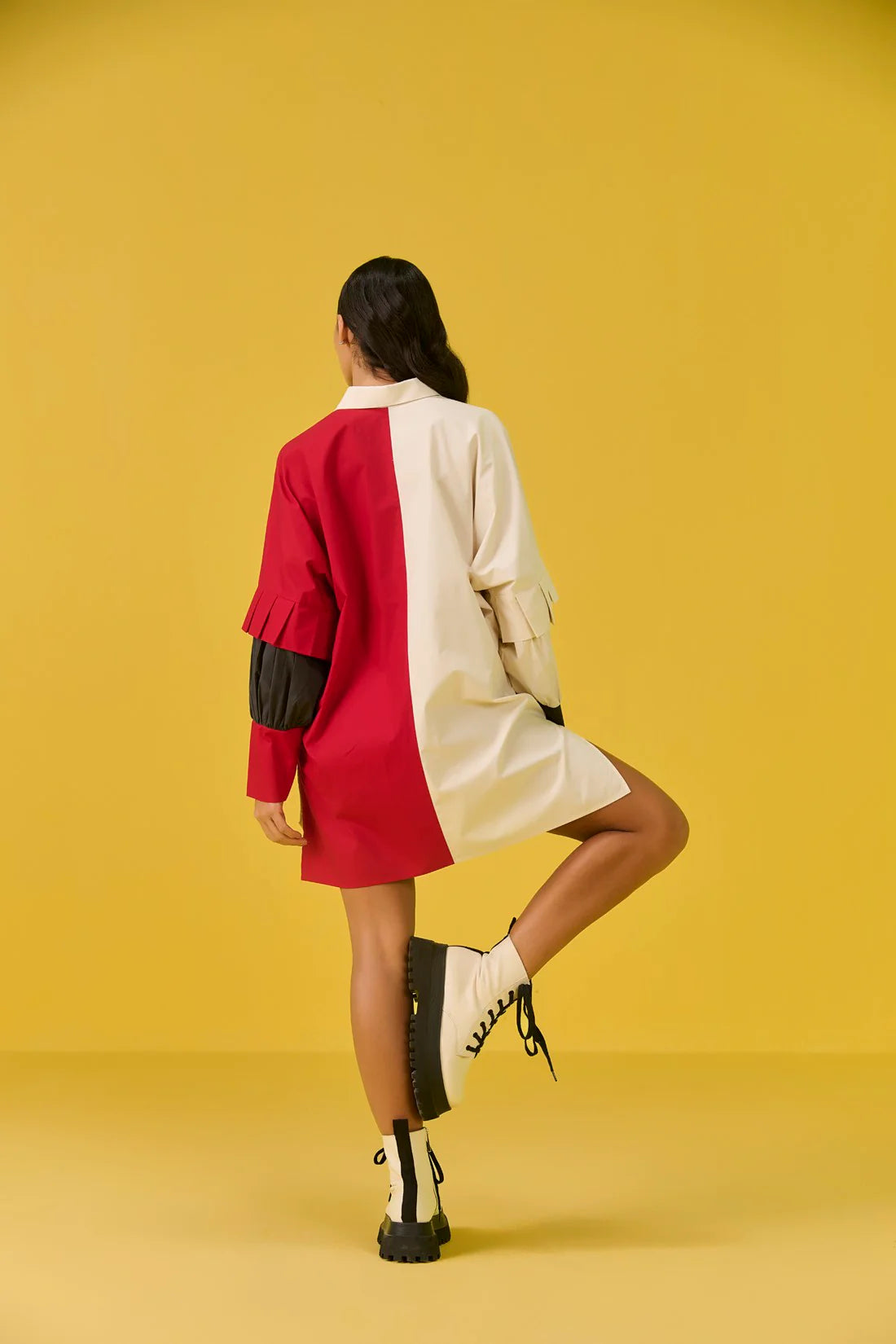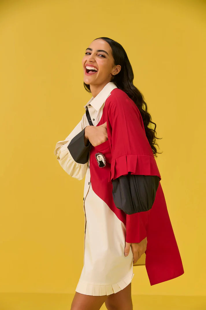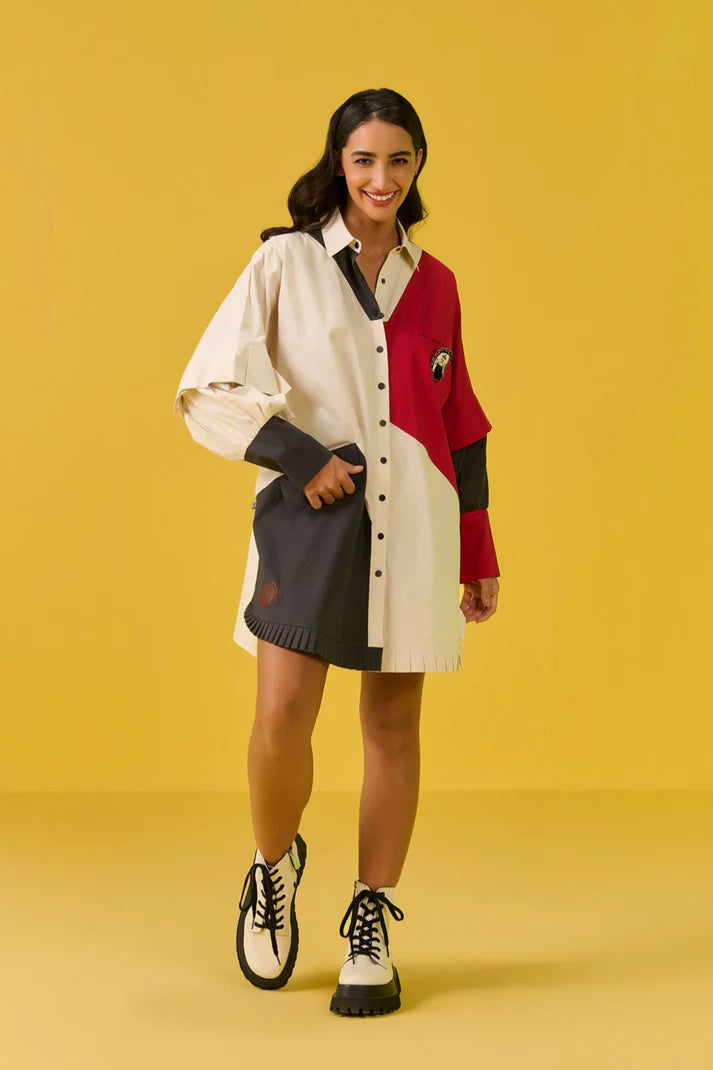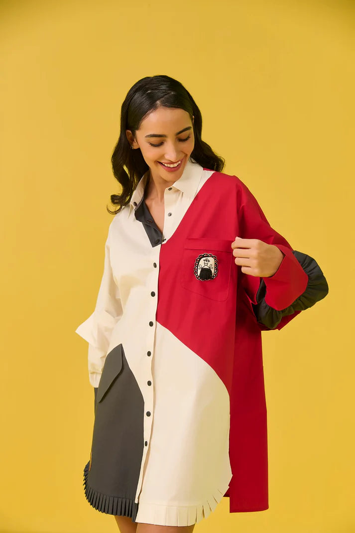 This isn’t just a shirtdress; it’s a color-block canvas ready for your next adventure. We have thrown in playful pleats on the hemline for a flirty swish, while diagonal pockets offer stylish slant. The long, statement cuffs are beautifully balanced by soft, billowy gathers on the sleeves. It’s quirky, it’s chic and it’s ready to make a statement.