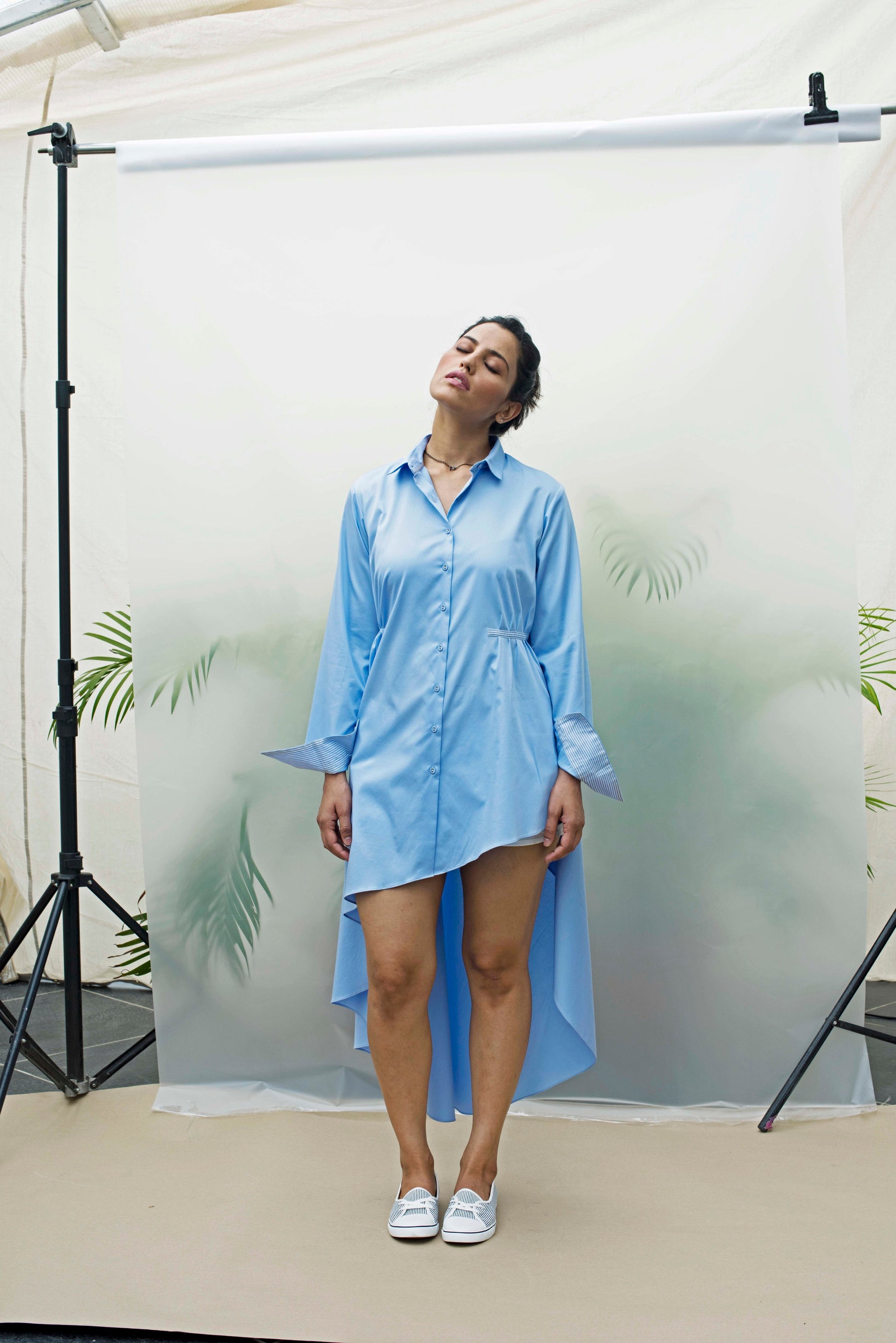 Asymmetrical cut shirtdress featuring shorter front and longer length at the back with handstitched ruched detail on the side