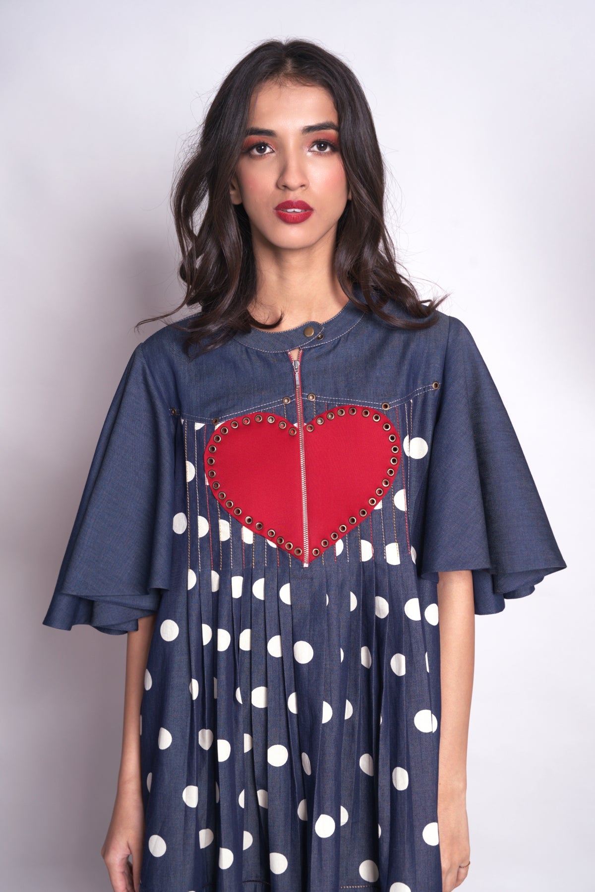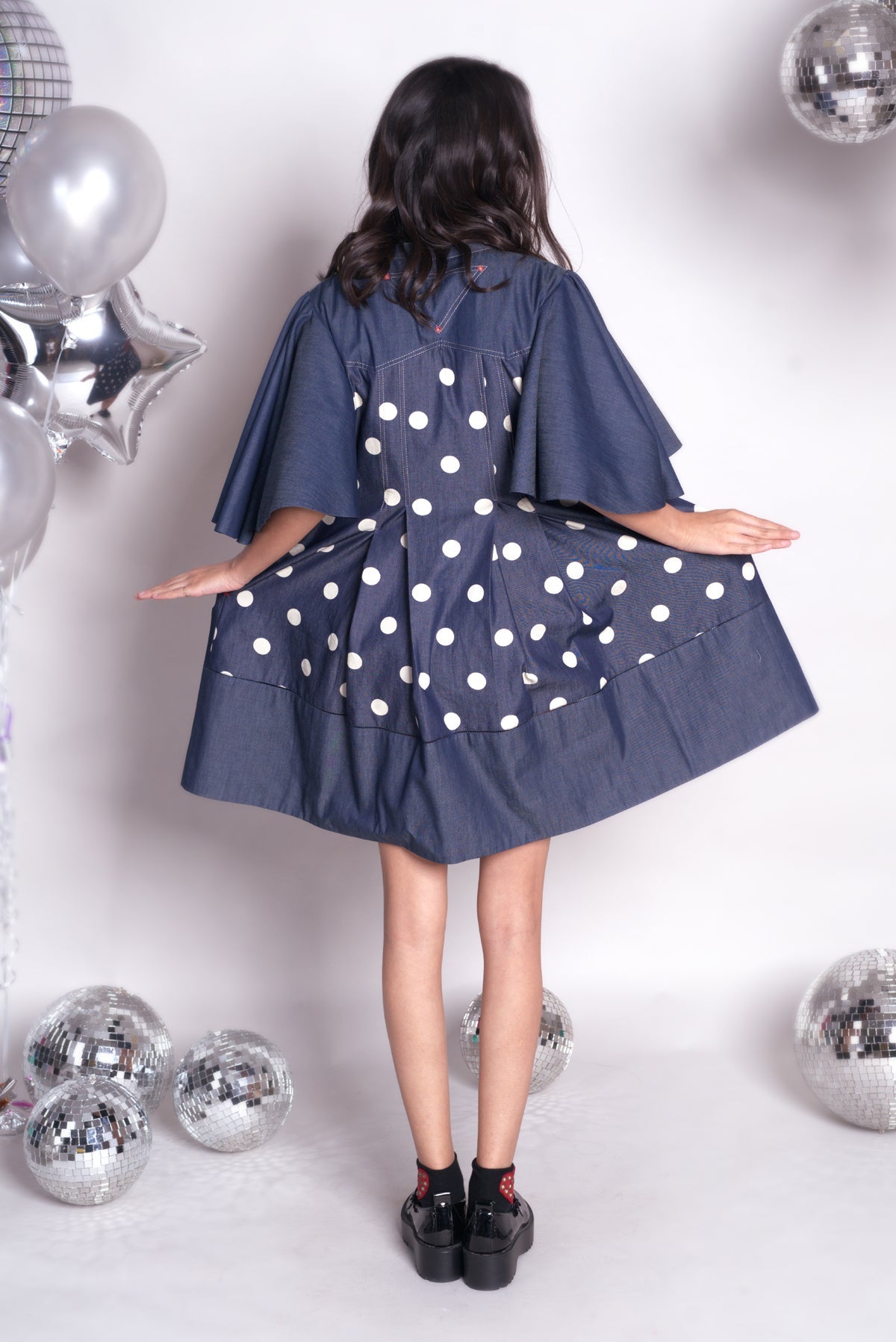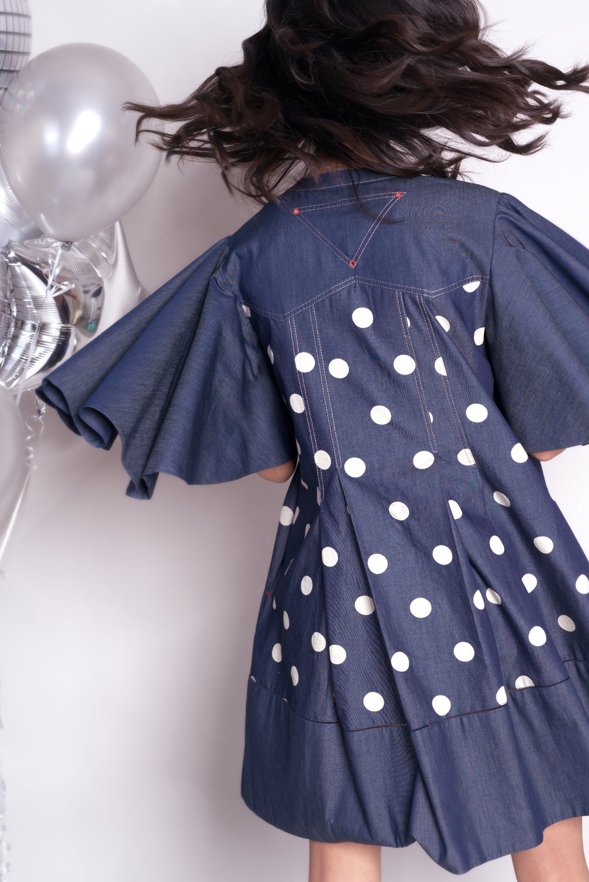 - Short anti-fit dress with exaggerated flared sleeves in polka dots denim