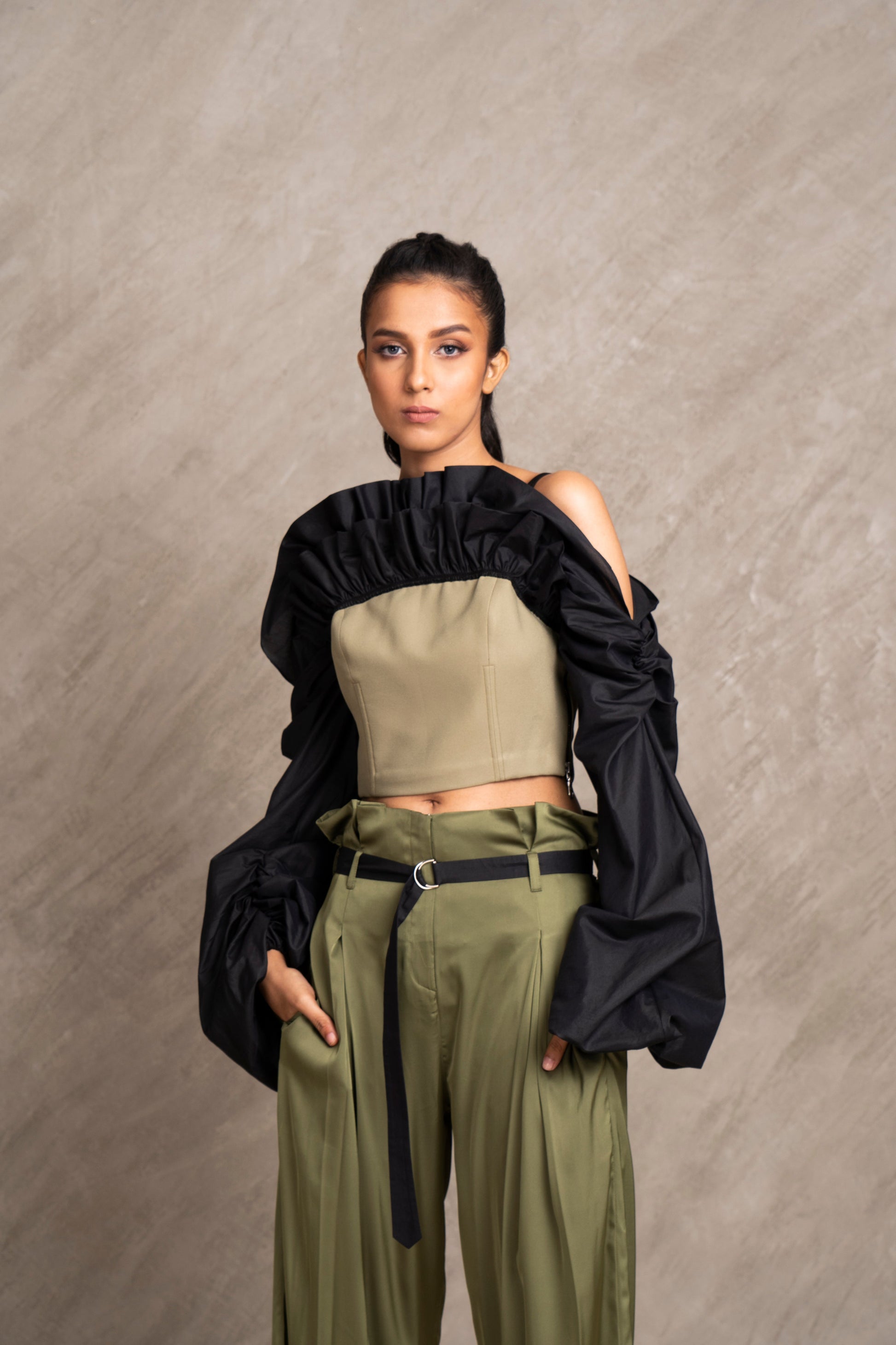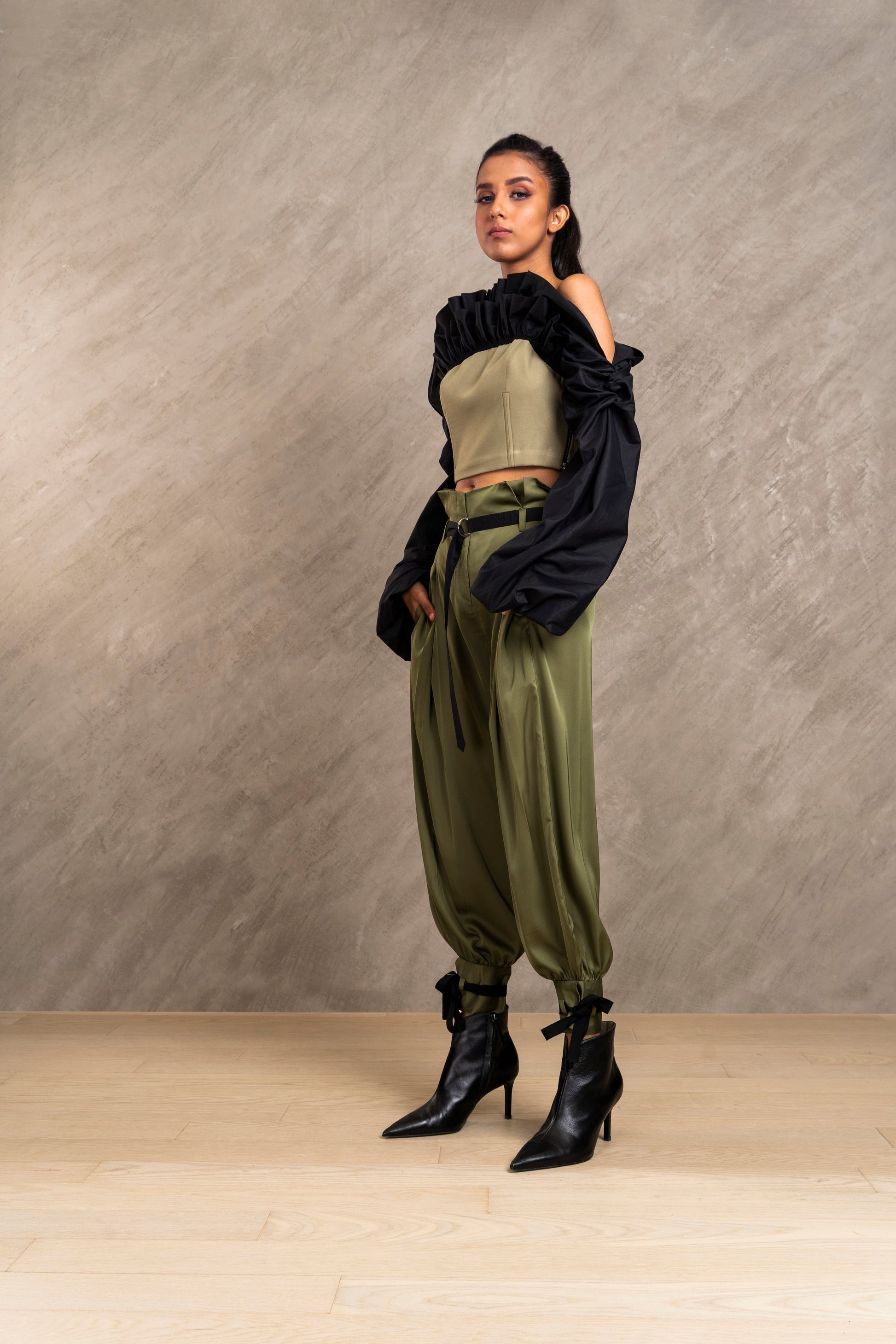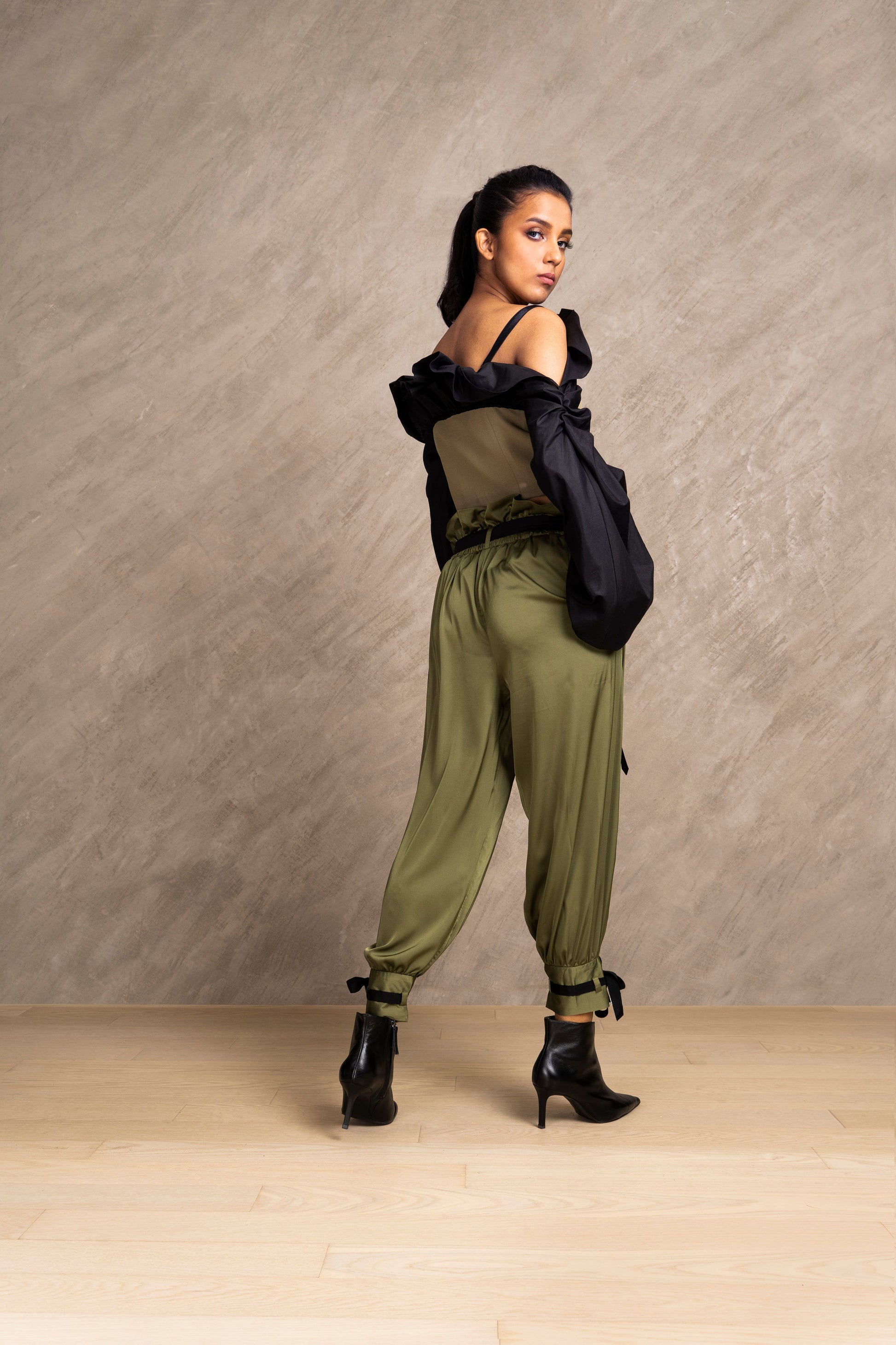 High waisted pleated pants in Japanese satin with black cotton silk belt around the waist which falls in a shape of a tie featuring black imported ribbons for the tie ups at the bottom.